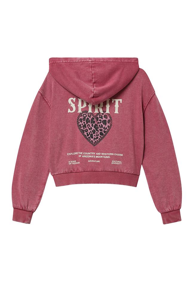 Толстовка имеет свободный крой, удобный капюшон и манжеты на рукавах и по низу изделия. Розовый цвет и яркий принт с надписью "SPIRIT" и изображением леопарда на спине делают эту модель особенно привлекательной.