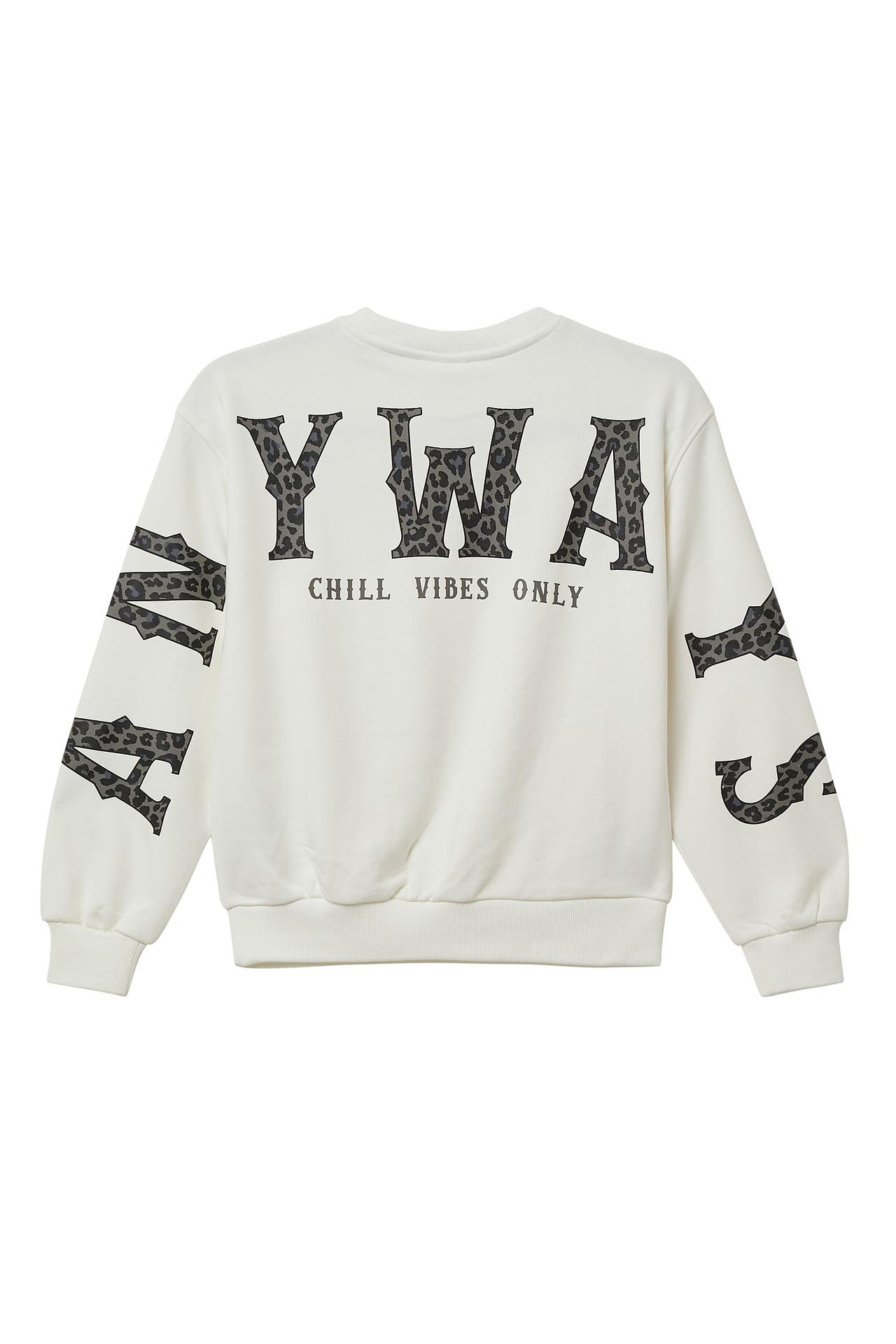 - Дизайн: Классический крой джемпера дополнен эффектным принтом с надписью "YWA CHILL VIBES ONLY" на спине и рукавах. Этот элемент придает модели современный и игривый вид, который обязательно понравится детям.