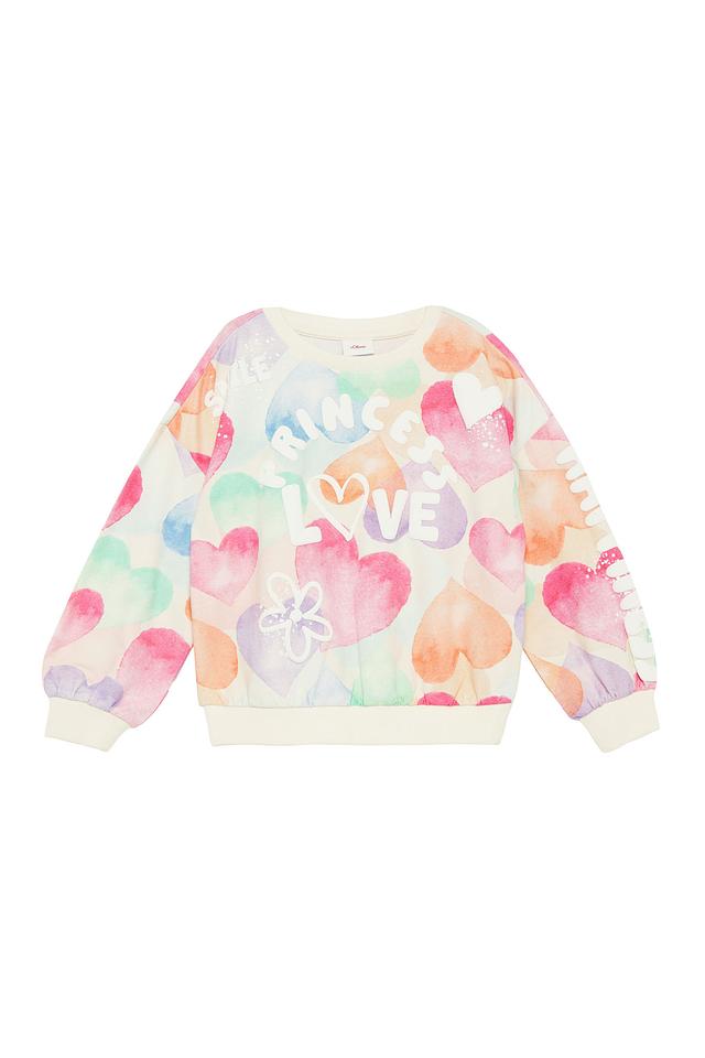 Этот очаровательный джемпер от s.Oliver станет прекрасным дополнением к гардеробу юной модницы. Выполненный в белом цвете, он украшен красочным принтом в виде сердечек и надписей "Princess Love" и "Spread Love and Joy".