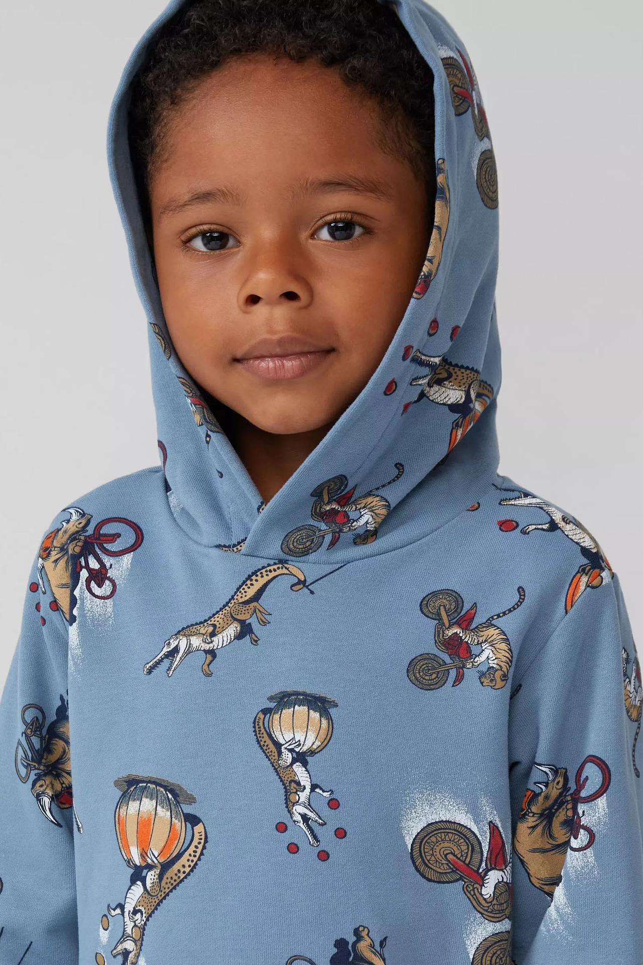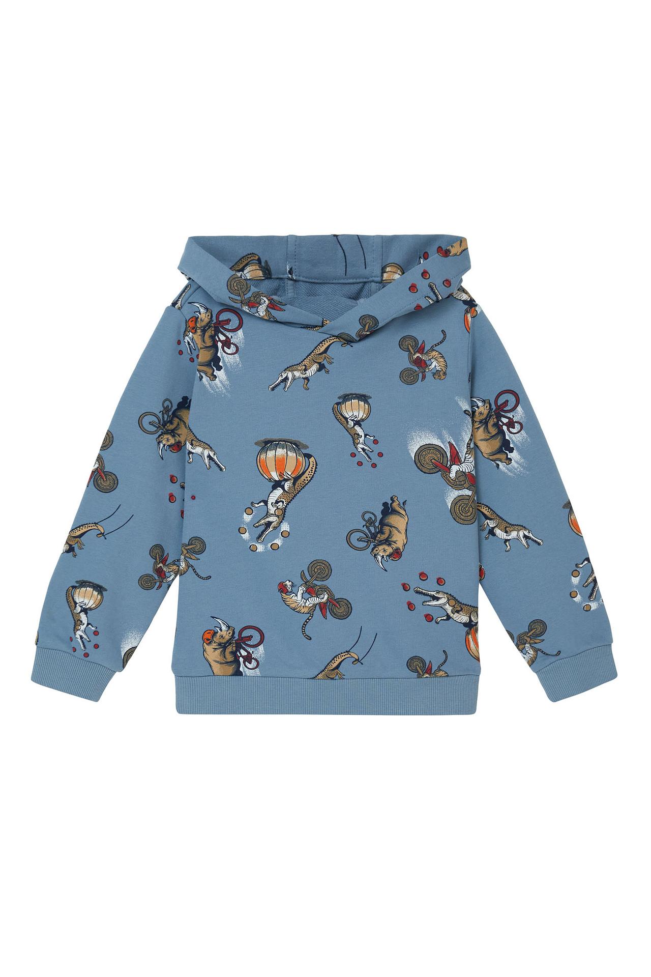 Яркий и удобный джемпер от s.Oliver создан специально для юных непосед. Оригинальный принт с изображением животных и цирковых артистов сделает образ вашего ребенка уникальным и запоминающимся. Модель с капюшоном подарит дополнительный уют в прохладную погоду. Отличный выбор для повседневной носки, прогулок и активных игр.