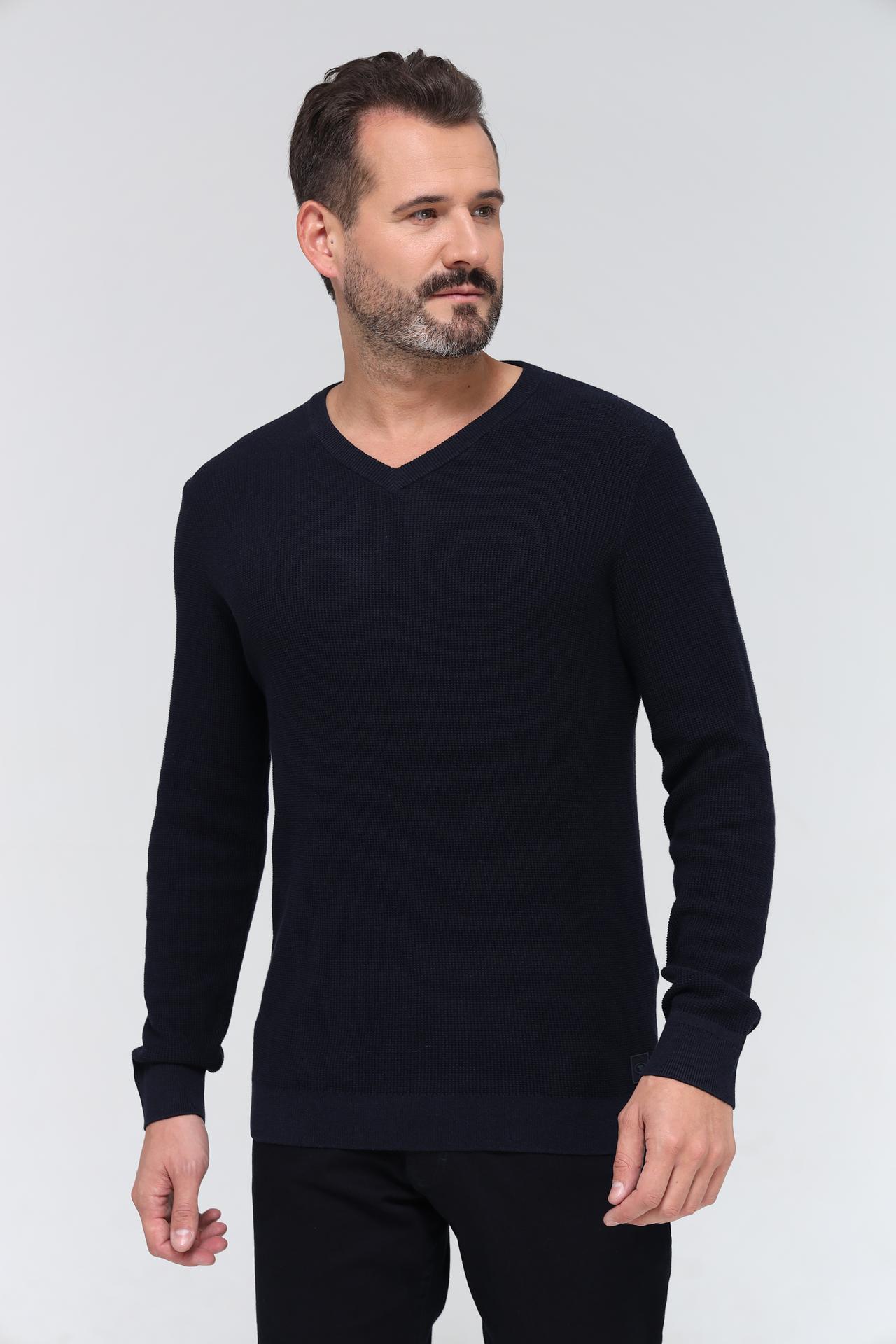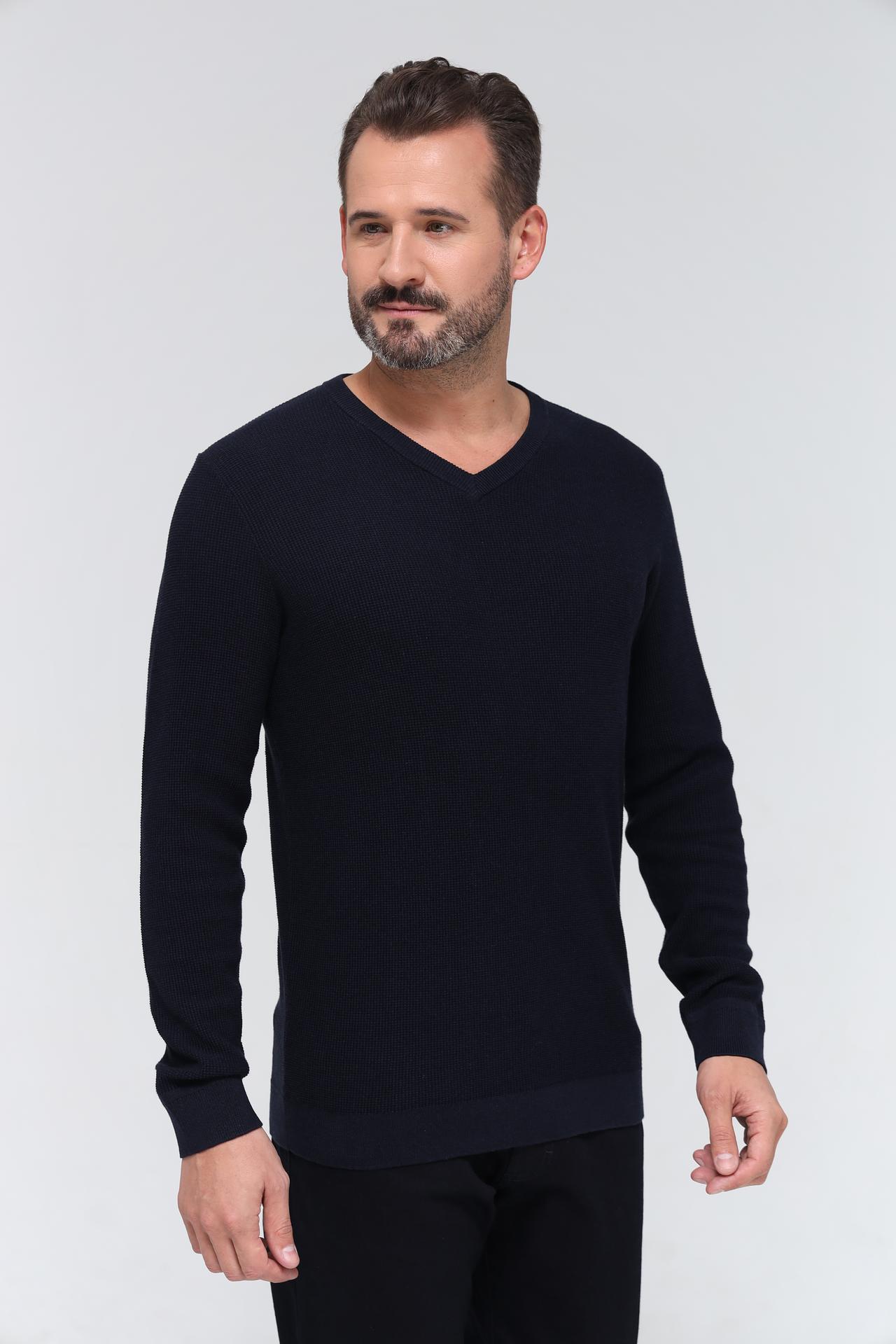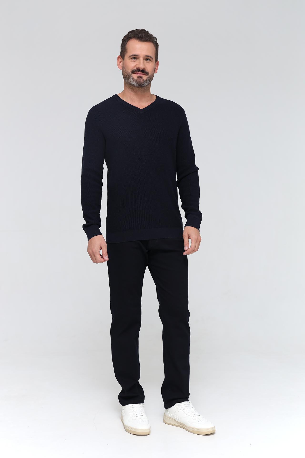 Тёмно-синий пуловер с V-образным вырезом станет незаменимой вещью в вашем гардеробе. Он легко сочетается с джинсами, брюками и шортами, что делает его идеальным выбором для любого случая.