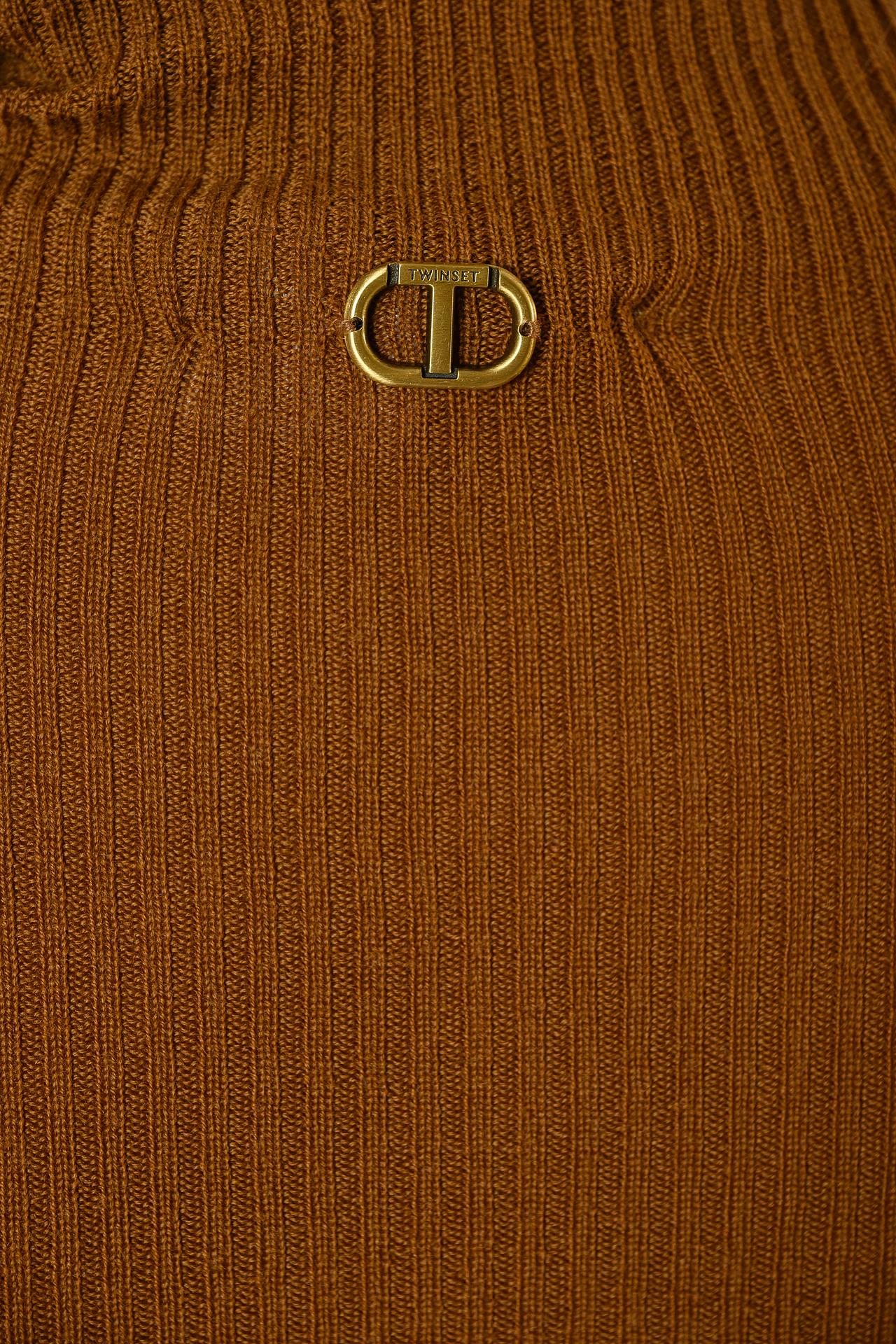 Теплый и стильный джемпер Twin Set из 100% шерсти станет отличным дополнением вашего осенне-зимнего гардероба. Модель выполнена в элегантном коричневом цвете и украшена золотистым логотипом бренда на спине.