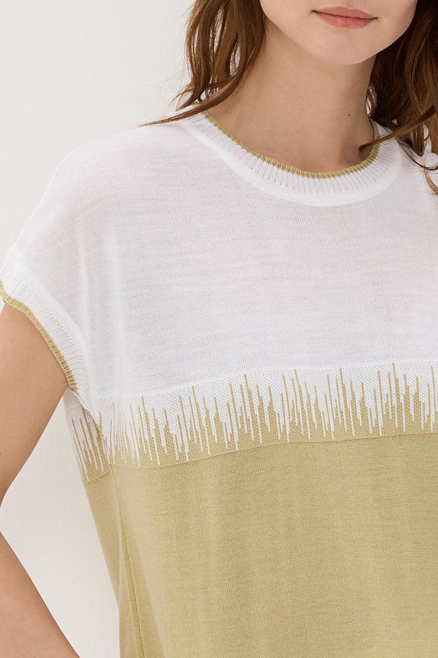 Особенностью модели является декор в виде бахромы, расположенной на линии груди, что придает ей оригинальность и выразительность. Короткие рукава делают этот джемпер идеальным выбором для теплой погоды.