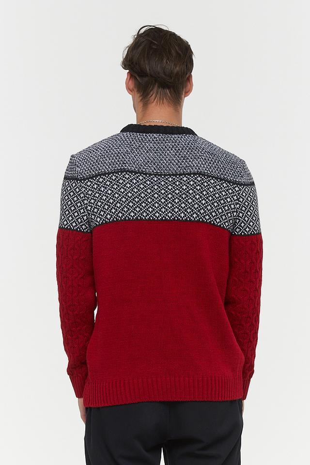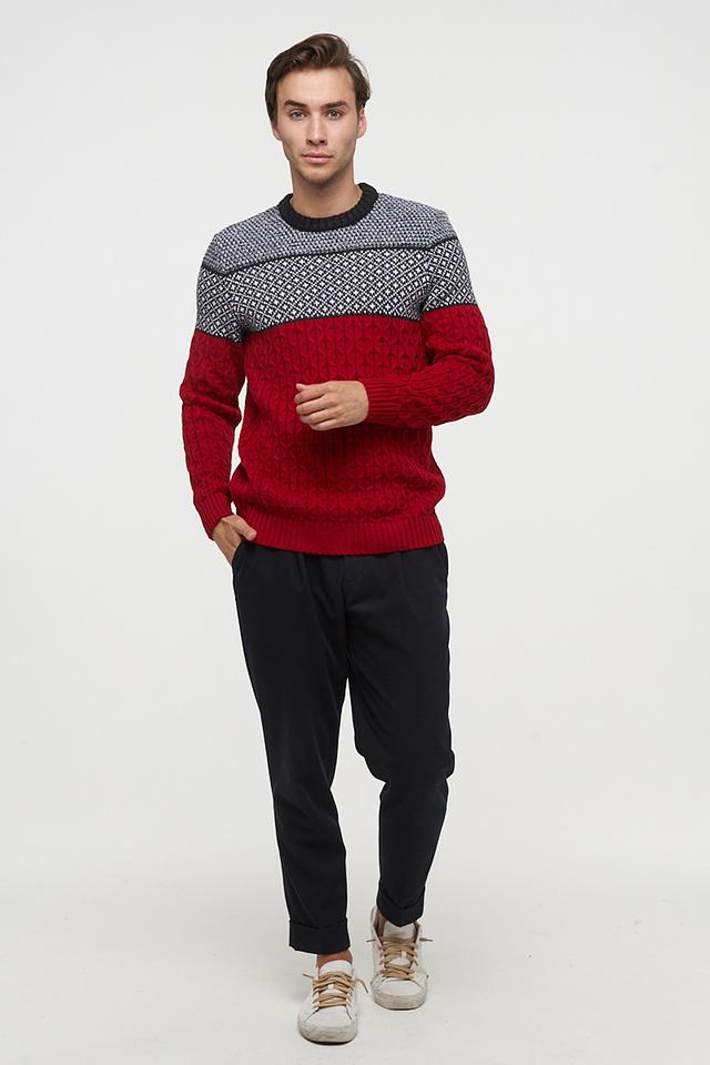 Мужской джемпер VAY красного цвета с оригинальным жаккардовым узором. Изготовлен из сочетания шерсти и пана, обеспечивающего комфорт и тепло. Идеально подходит для создания стильного повседневного образа. Состав: пан 70%, шерсть 30%