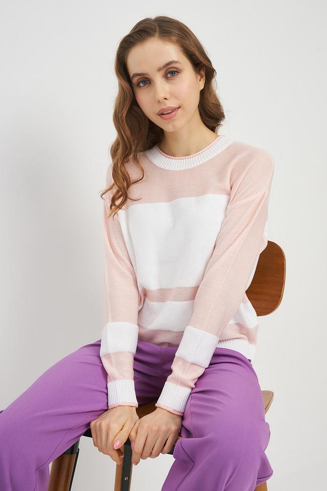 Этот джемпер от VAY станет отличным дополнением к вашему гардеробу. Он выполнен в нежном розовом цвете с контрастными белыми полосами, что придает ему свежий и современный вид.