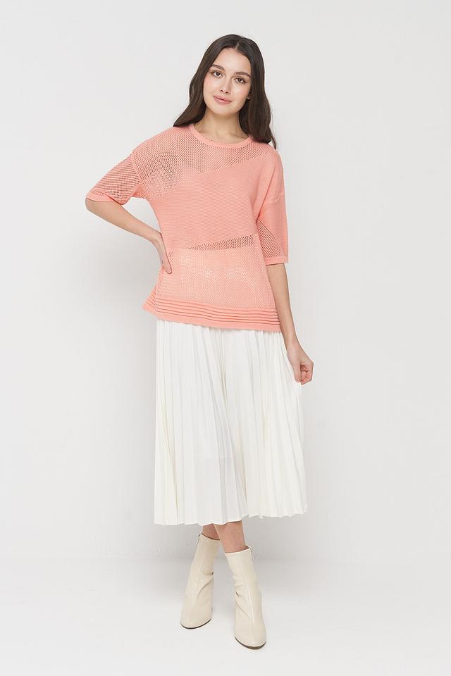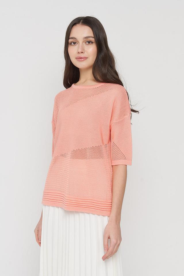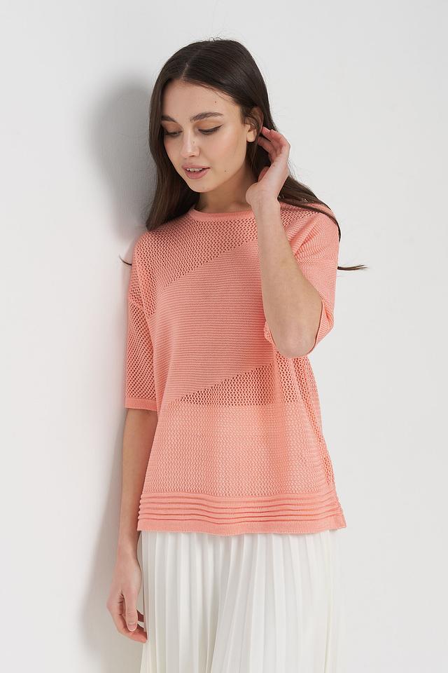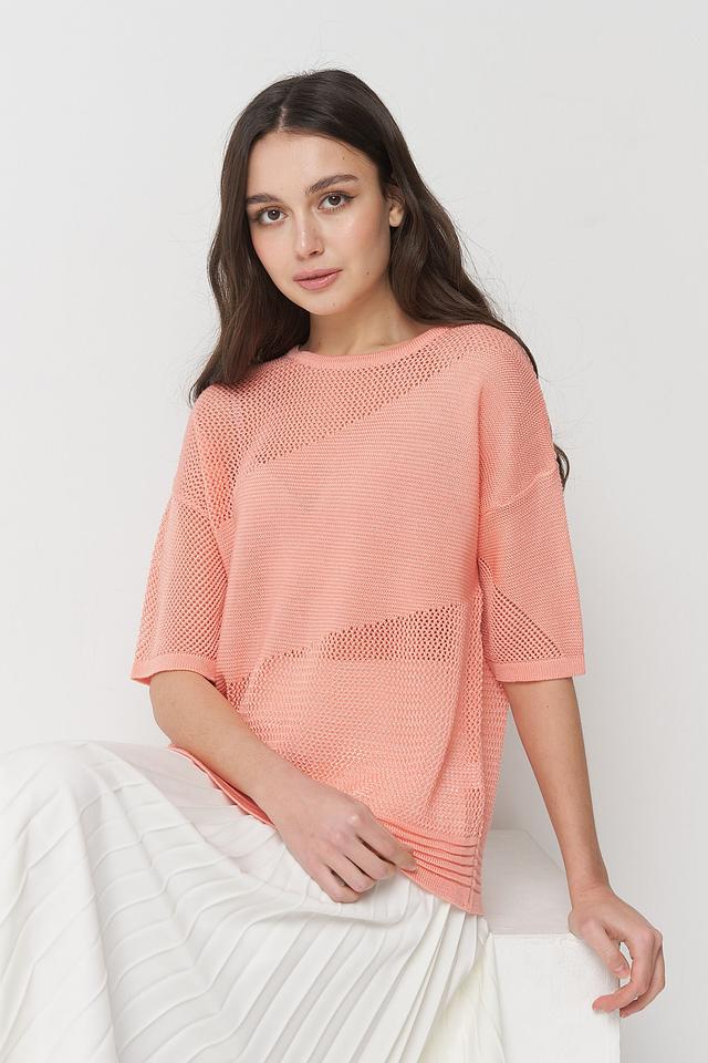 Джемпер имеет свободный крой, который не сковывает движения и обеспечивает максимальный комфорт. Короткий рукав и круглый вырез делают этот джемпер универсальным элементом гардероба. Ажурная вставка придает изделию легкость и оригинальность.