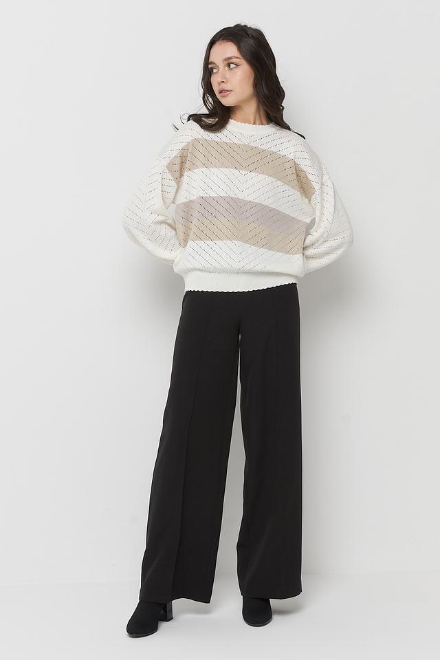 Вырез горловины также обработан волнистой кромкой, что создает аккуратный и завершенный вид. Этот джемпер идеально сочетается с брюками, юбками и джинсами, позволяя создавать разнообразные образы для повседневной жизни и особых случаев.