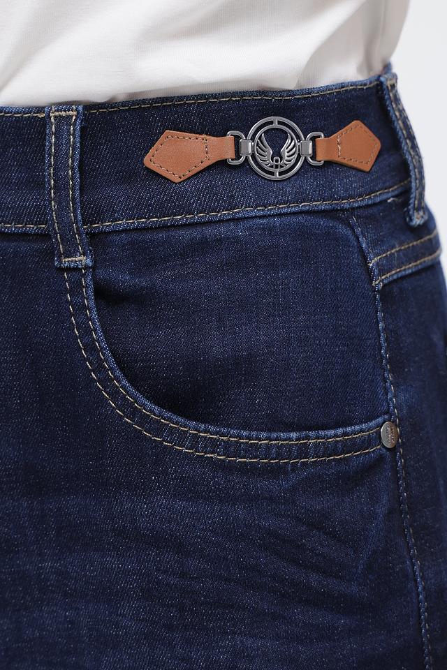 Джинсы выполнены из высококачественного хлопка с добавлением полиэстера и эластана, что обеспечивает комфорт в носке, хорошую посадку и долговечность. Высокая посадка визуально удлиняет ноги и подчеркивает талию. Пояс дополнен стильным ремнем.