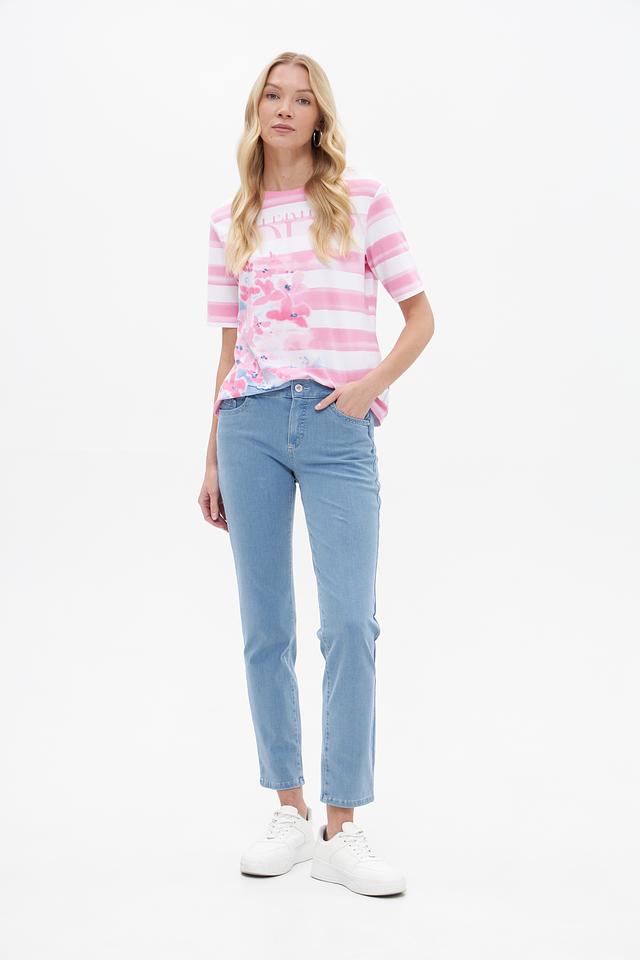 Джинсы имеют прямой крой, плавно зауженный к низу, что обеспечивает комфортную посадку и визуально удлиняет ноги. Ткань деликатного денима средней плотности приятна к телу и обеспечивает свободу движений. Модель дополнена классическими карманами спереди и накладными карманами сзади.