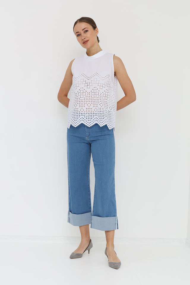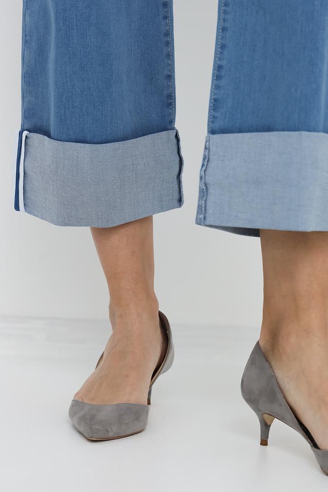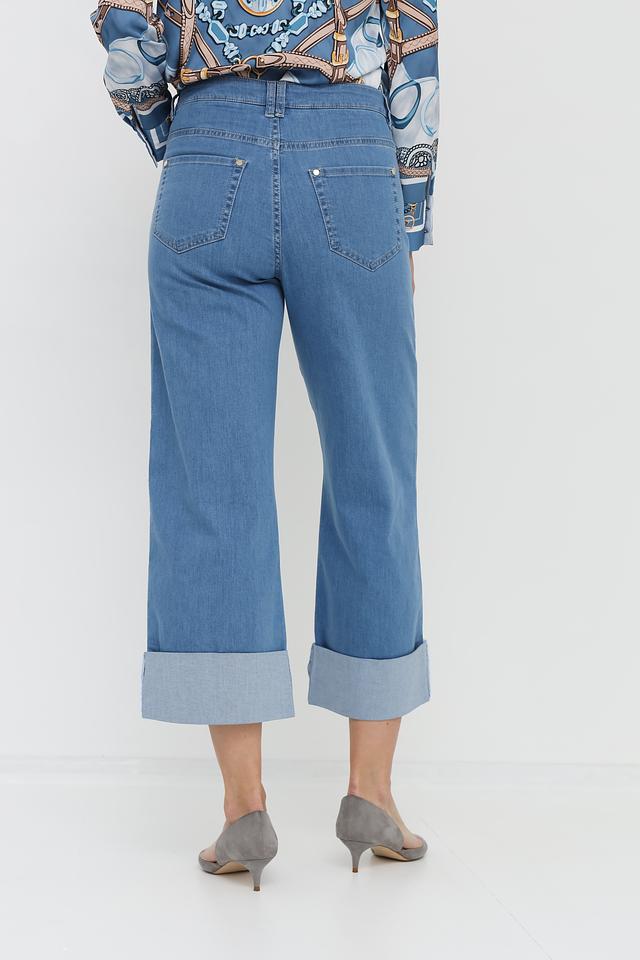 Особенностью данной модели являются широкие штанины, которые сужаются к низу, создавая эффект кюлотов. Подвернутые штанины добавляют образу оригинальности и непринужденности. Классическая посадка и пятикарманный крой делают эти джинсы универсальными и подходящими для различных типов фигуры.