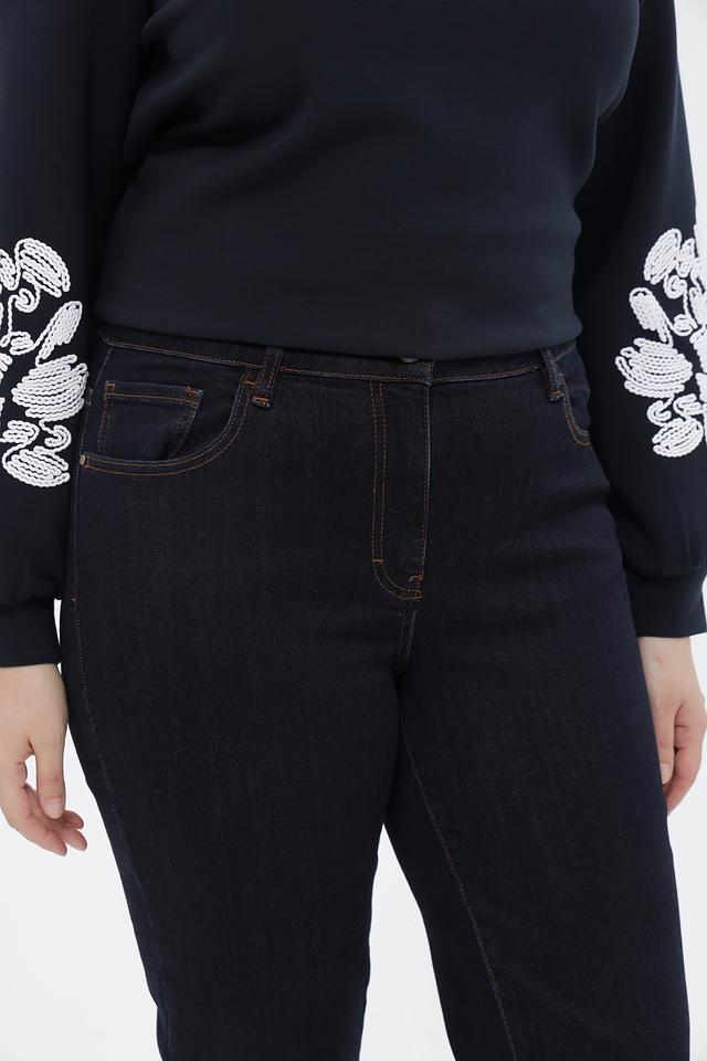 Джинсы имеют высокую посадку и классический клёш, что визуально удлиняет ноги и создает элегантный силуэт. На задних карманах присутствует декоративная строчка, подчеркивающая стиль и индивидуальность изделия. Тёмно-синий цвет делает эти джинсы универсальным элементом гардероба, который легко сочетается с различными видами верха.
