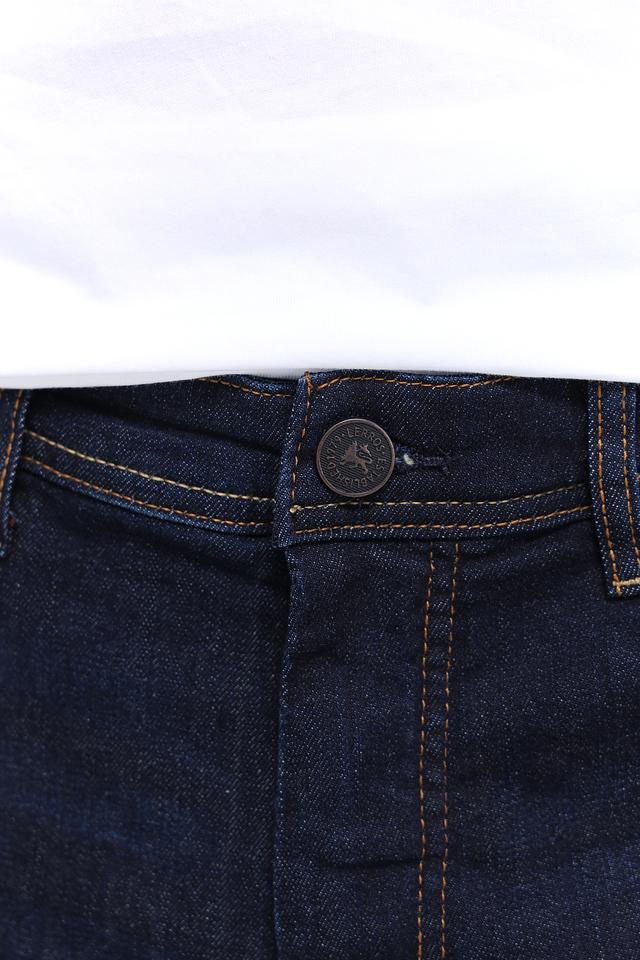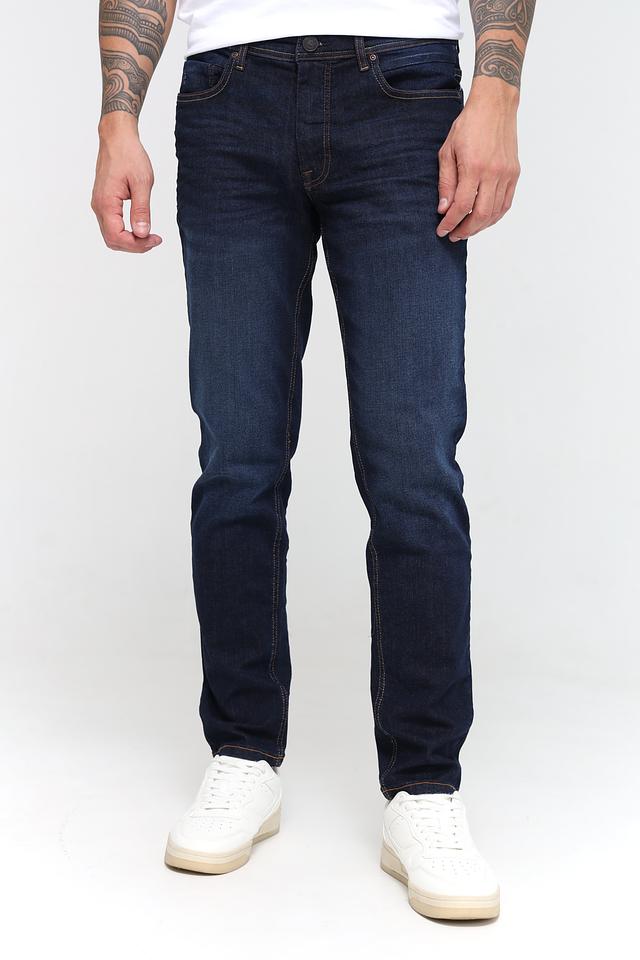 Застёжка на металлическую пуговицу и молнию. Пять карманов – два передних, два задних и один небольшой карман для мелочи. Тёмно-синий цвет джинсов дополнен контрастной отстрочкой швов. Данная модель станет отличным дополнением к вашему повседневному гардеробу.
