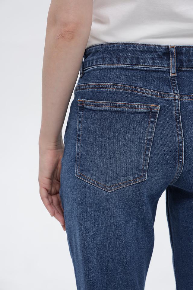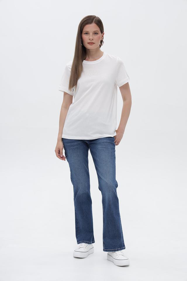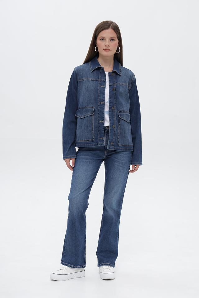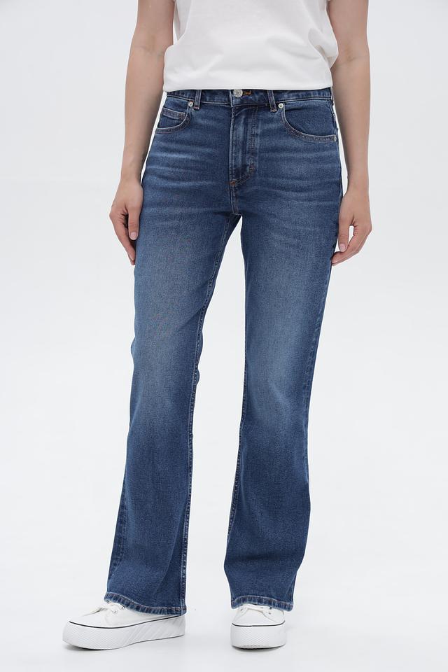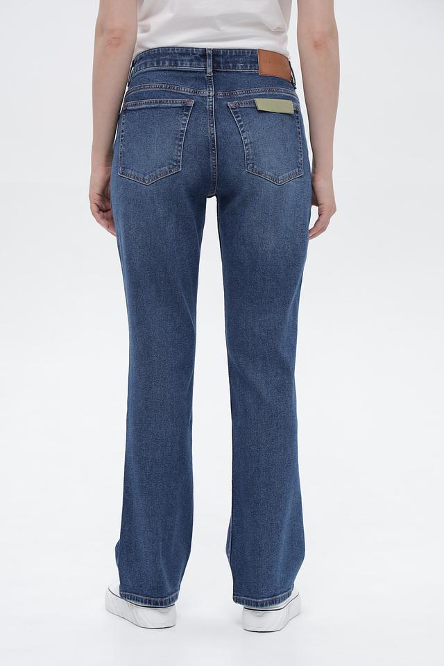 Джинсы имеют высокую посадку, подчеркивающую талию, и широкую штанину, начинающуюся от бедра. Пять функциональных карманов обеспечивают практичность. Обработка денима создает эффект легких потертостей, придавая джинсам винтажный вид.