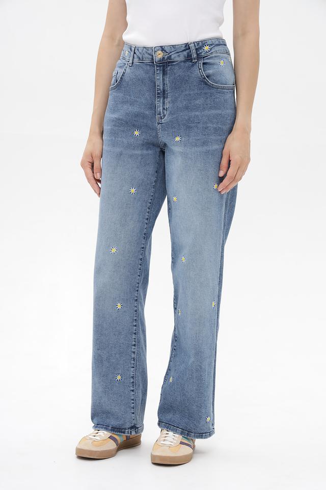 Женские джинсы прямого кроя от бренда More and More выполнены в нежном голубом цвете и украшены вышивкой в виде ромашек. Модель имеет высокую посадку, что визуально удлиняет ноги и подчеркивает талию.