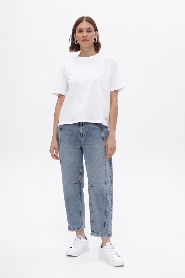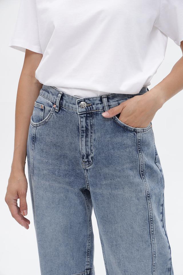 Джинсы отличаются оригинальным дизайном с декоративными швами, которые подчеркивают их уникальность. Наличие накладного кармана сзади добавляет практичности. Высокая посадка визуально удлиняет ноги и подчеркивает талию.