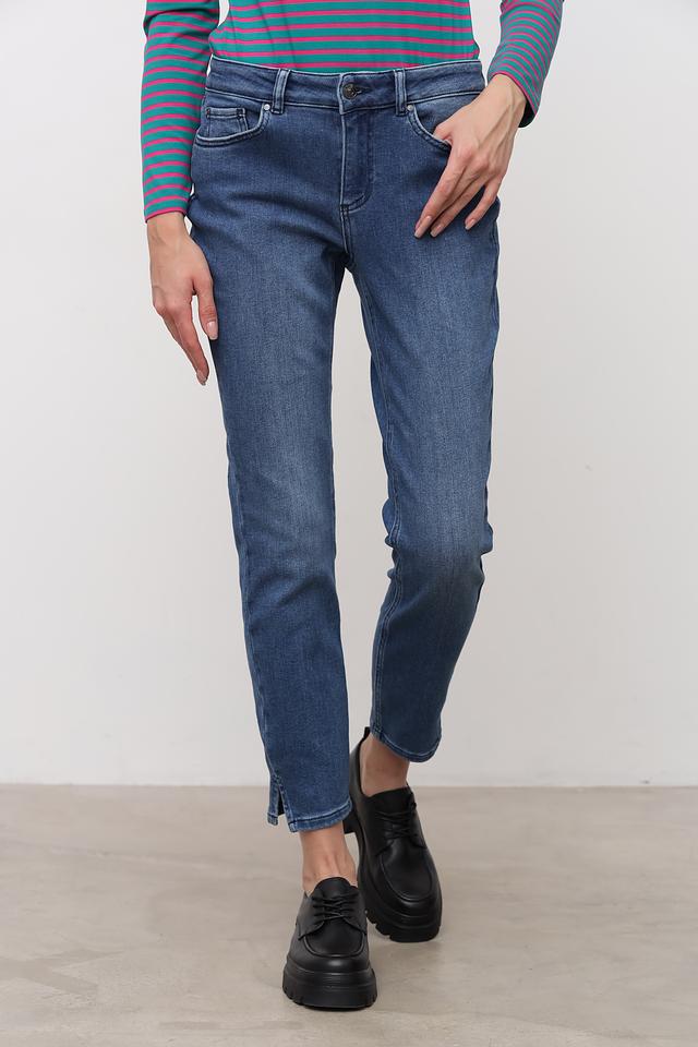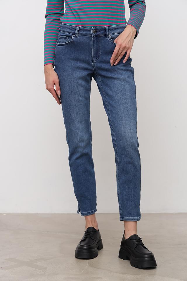 Синие джинсы Oui классического кроя с небольшим разрезом на штанине. Модель выполнена из качественного хлопка с добавлением полиэстера и эластана для комфорта и износостойкости. Состав: хлопок 95%, полиэстер 4%, эластан 1%