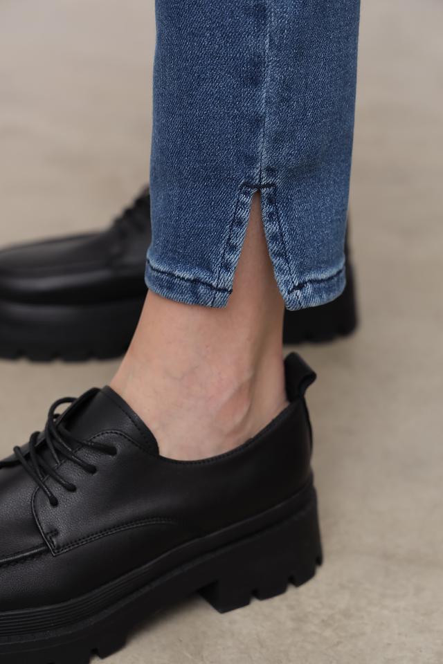Особенностью данной модели является небольшой разрез на штанине, который добавляет образу современный и непринужденный вид. Джинсы оснащены стандартной застежкой на пуговицу и молнию, а также имеют функциональные карманы спереди и сзади.