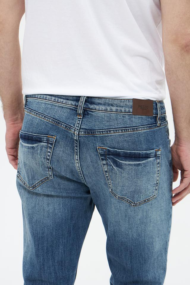 Представляем вашему вниманию мужские джинсы от бренда Pezzo. Модель выполнена в классическом синем цвете с выраженным эффектом потертости и легким выцветанием, что придает им современный и непринужденный вид.