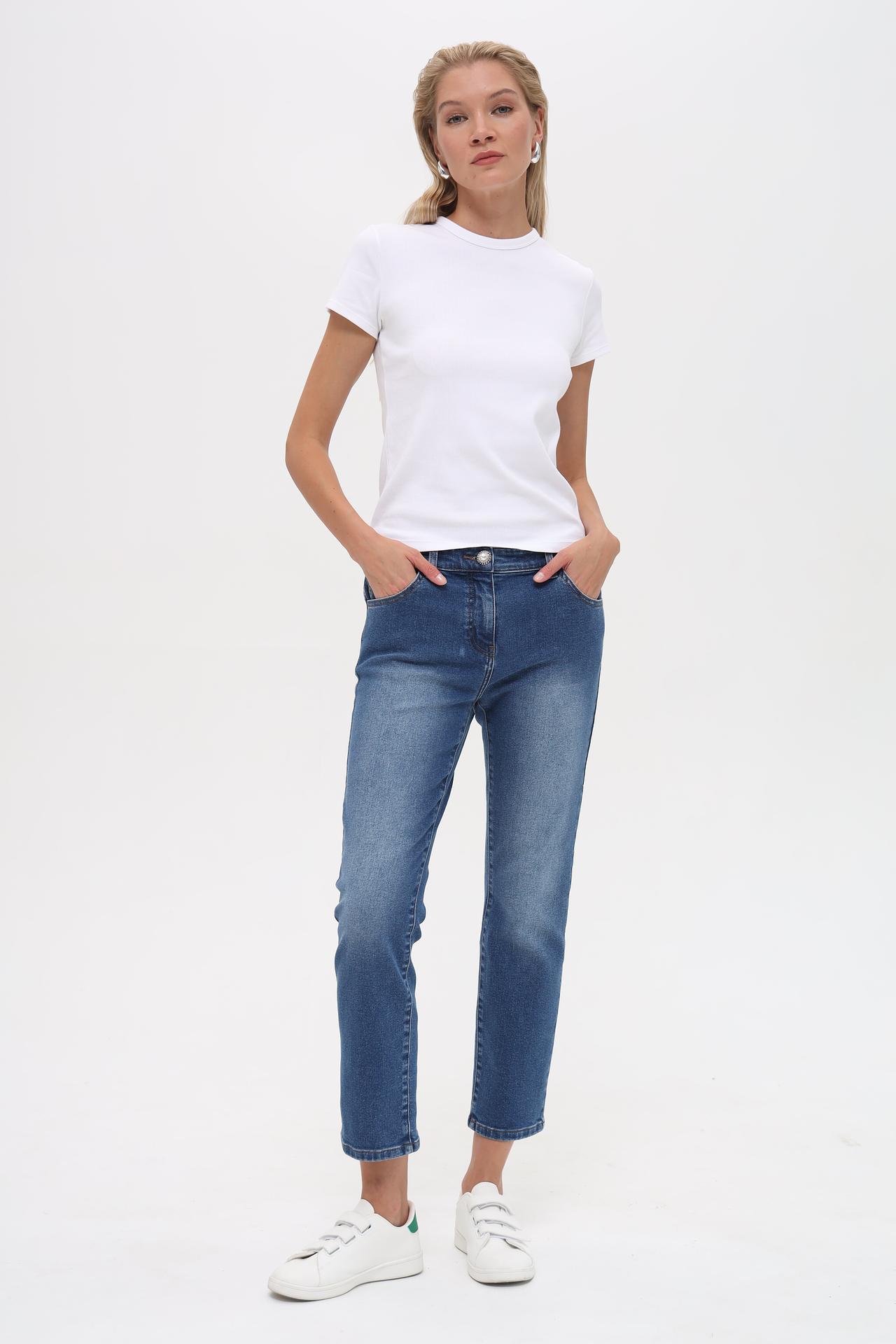 Синие джинсы с легким эффектом потертости добавляют образу стильную небрежность, оставаясь при этом базовым элементом гардероба. Декоративная пуговица с кристаллами на поясе подчеркивает индивидуальность и придает изысканный акцент. Универсальный синий оттенок легко сочетается с различной обувью и верхней одеждой, от кедов до туфель.