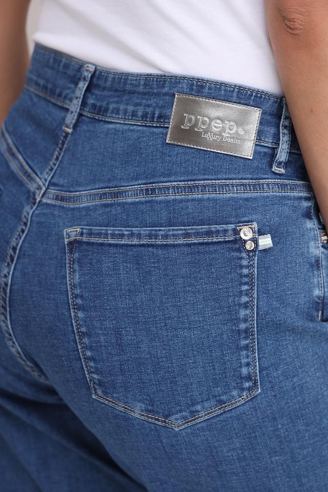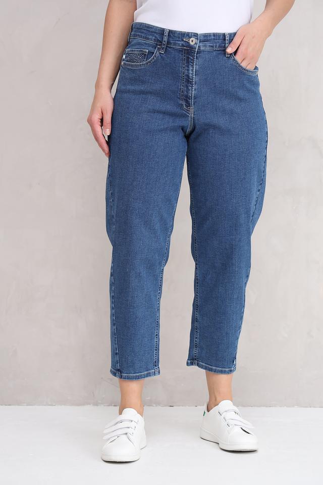 Синие джинсы Ppep. в стиле mom fit – удобная и стильная модель из хлопка с добавлением эластана. Высокая посадка и свободный крой обеспечивают комфорт, а декор на карманах добавляет оригинальности. Состав: хлопок 98%, эластан 2%