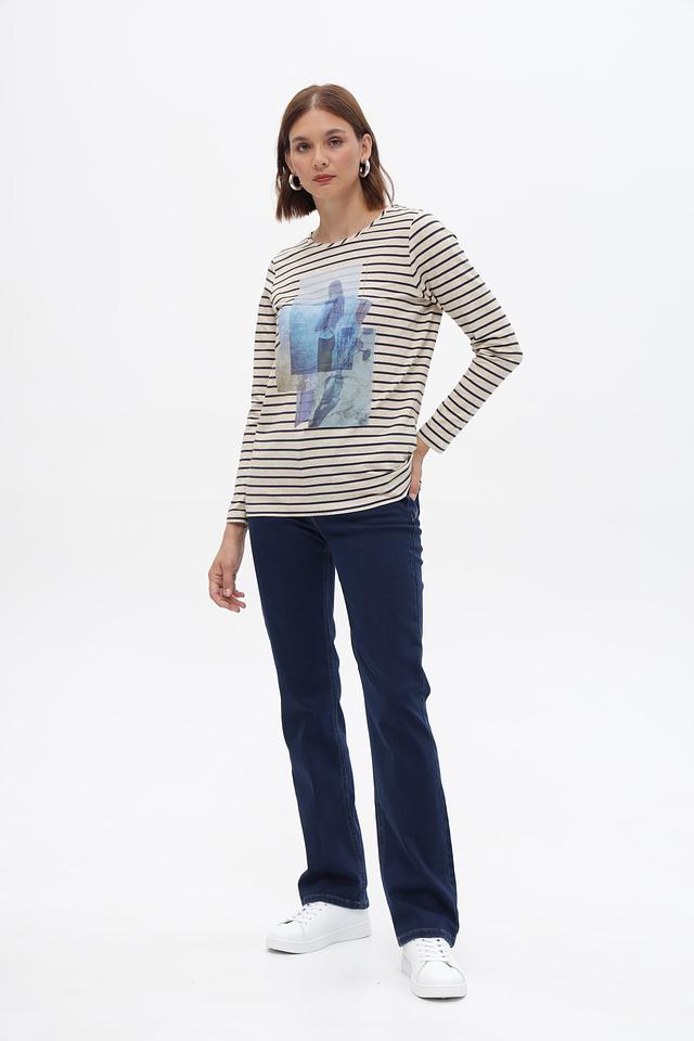 Низ джинсов выполнен с черной вставкой, что придает образу завершенность и стильный вид.