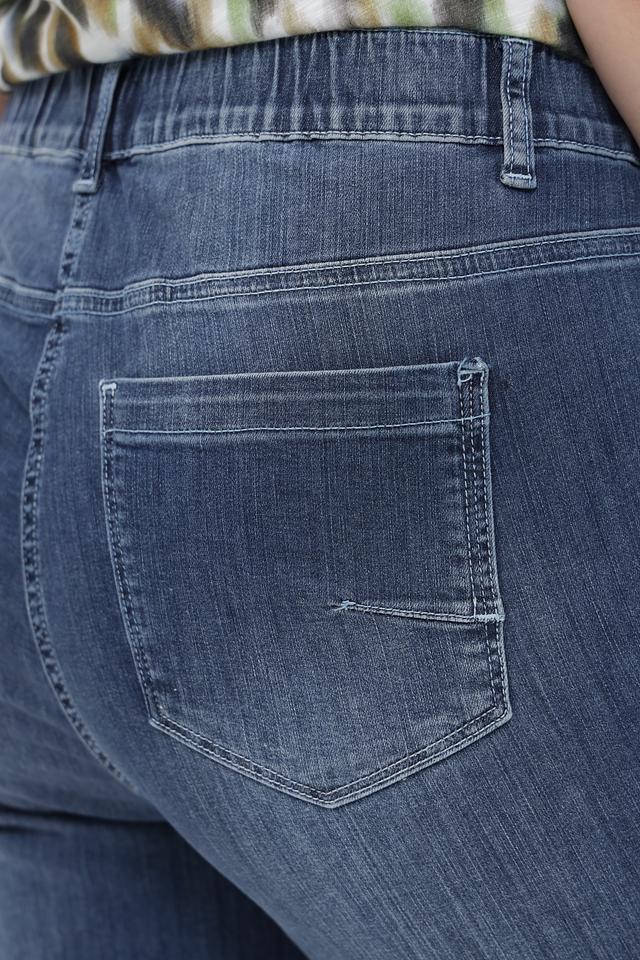 Джинсы имеют укороченный силуэт и эластичный пояс, обеспечивающий удобную посадку по фигуре. Подвернутые штанины добавляют образу непринужденности и легкости. Классический синий цвет и легкие потертости создают эффект легкого гранжа.