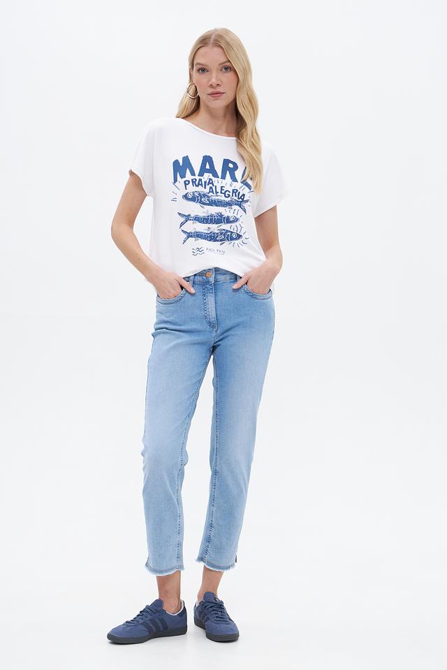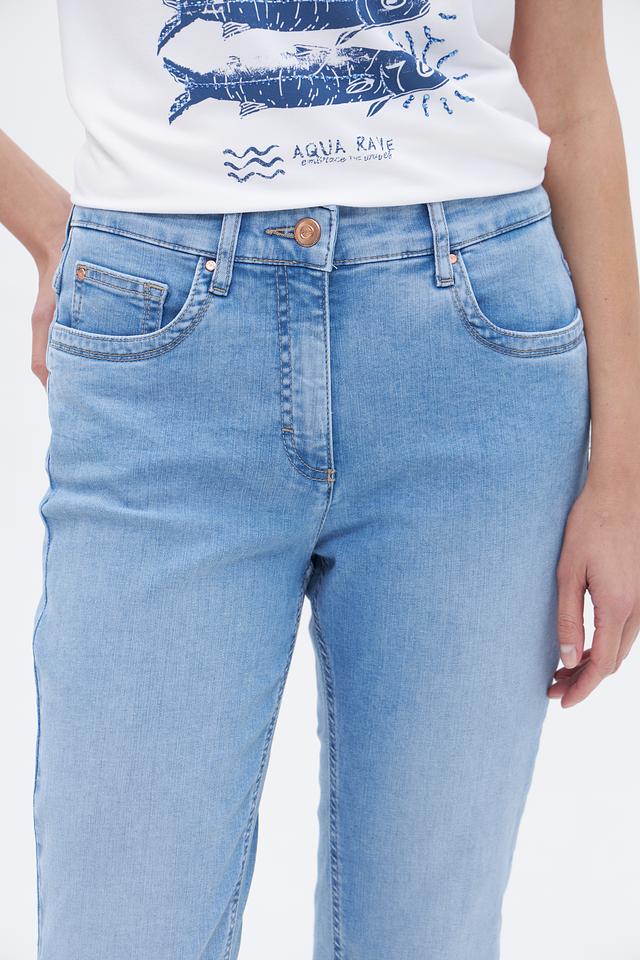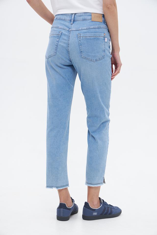 Джинсы имеют завышенную талию и укороченный прямой крой, что обеспечивает комфортную посадку и подчеркивает фигуру. Классическое оформление включает пятикарманный дизайн и фирменную фурнитуру ZRS.