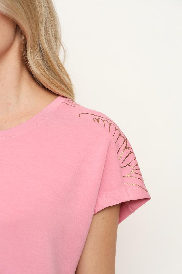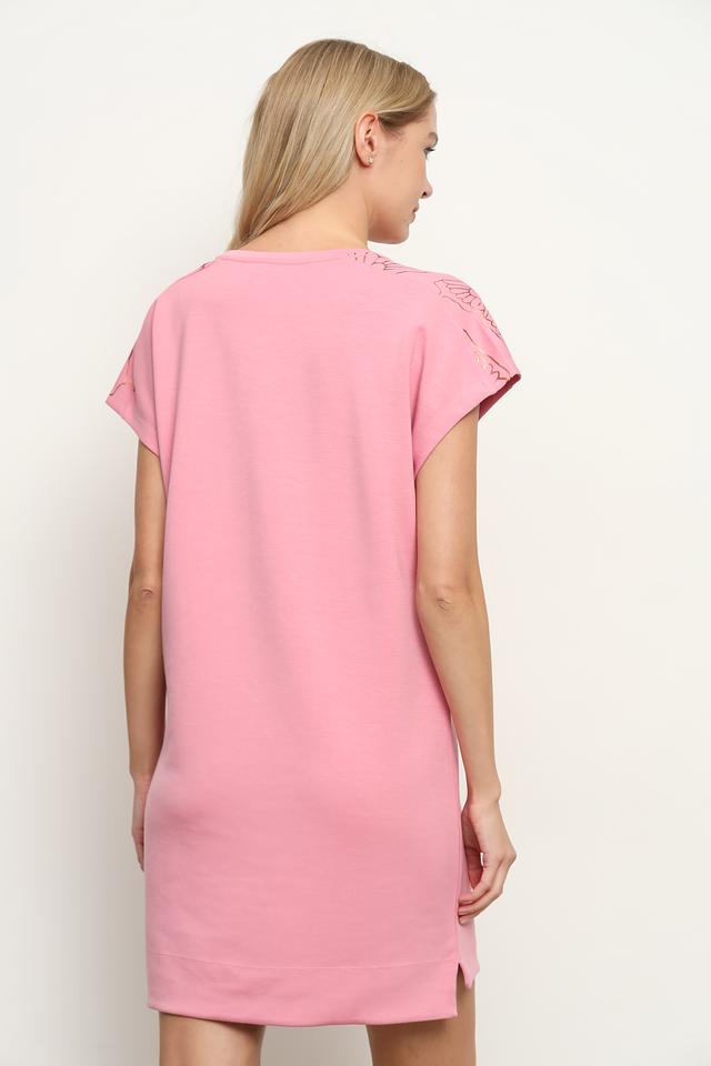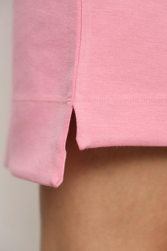 Платье имеет прямой силуэт и длину мини, что делает его удобным и практичным. Круглый вырез горловины и короткие рукава обеспечивают комфорт в жаркую погоду. Модель выполнена из высококачественного трикотажа, состоящего из полиэстера, модала и эластана.