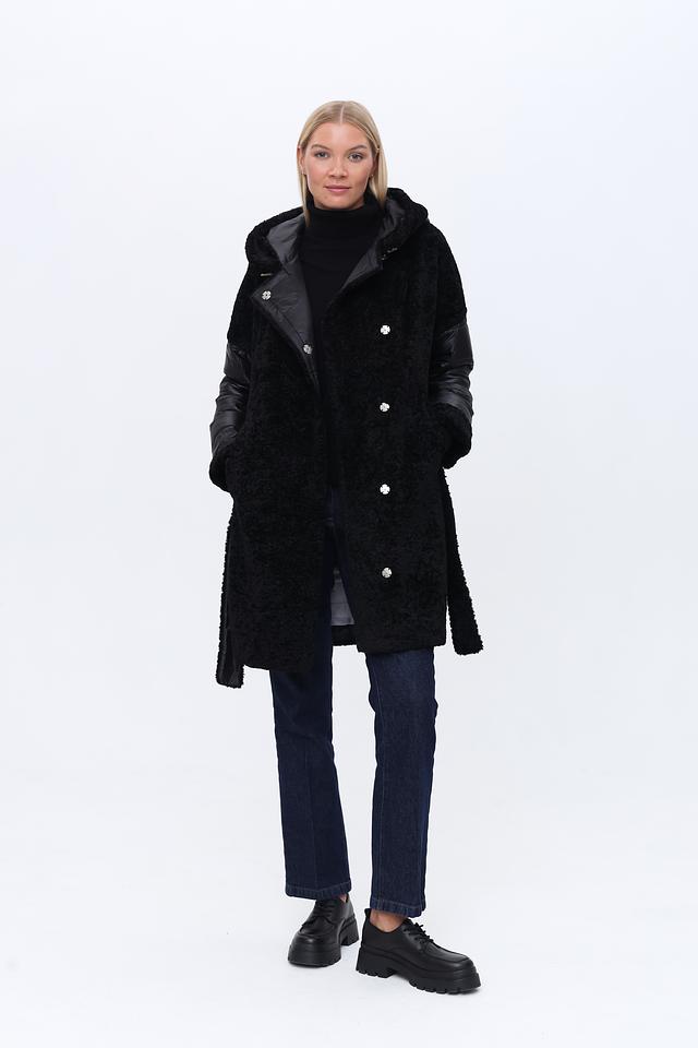 Чёрное пальто от Electra style – это стильное сочетание текстур: искусственный мех и стеганая плащёвка. Модель с капюшоном и поясом, идеально подходит для создания элегантного и комфортного образа. Состав: Состав_наполнитель полиэстер 100%, Состав_подкладка вискоза 80%, шерсть 65%, Состав_подкладка полиэстер 20%, ацетат 13%, вискоза 12%, полиэстер 10%
