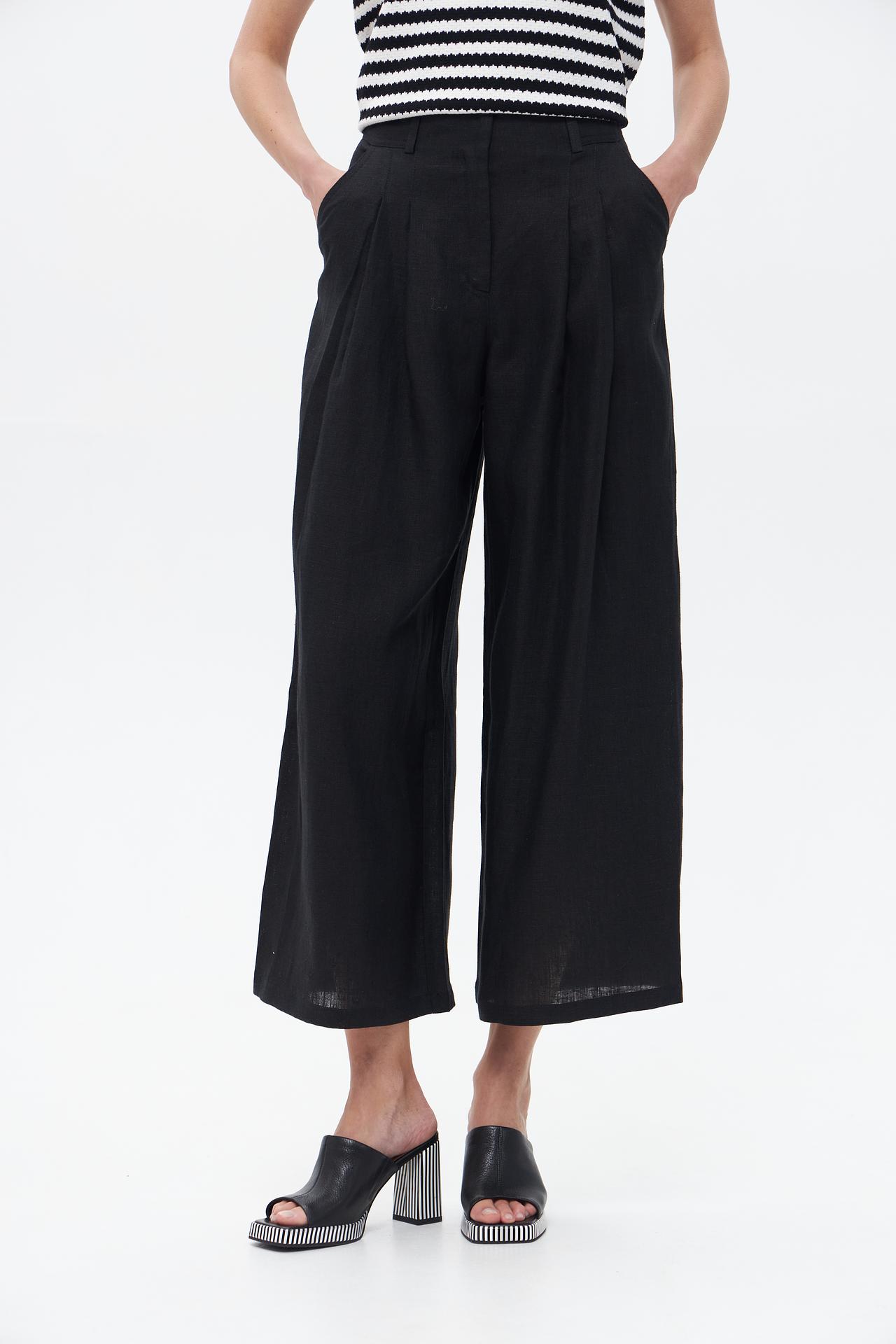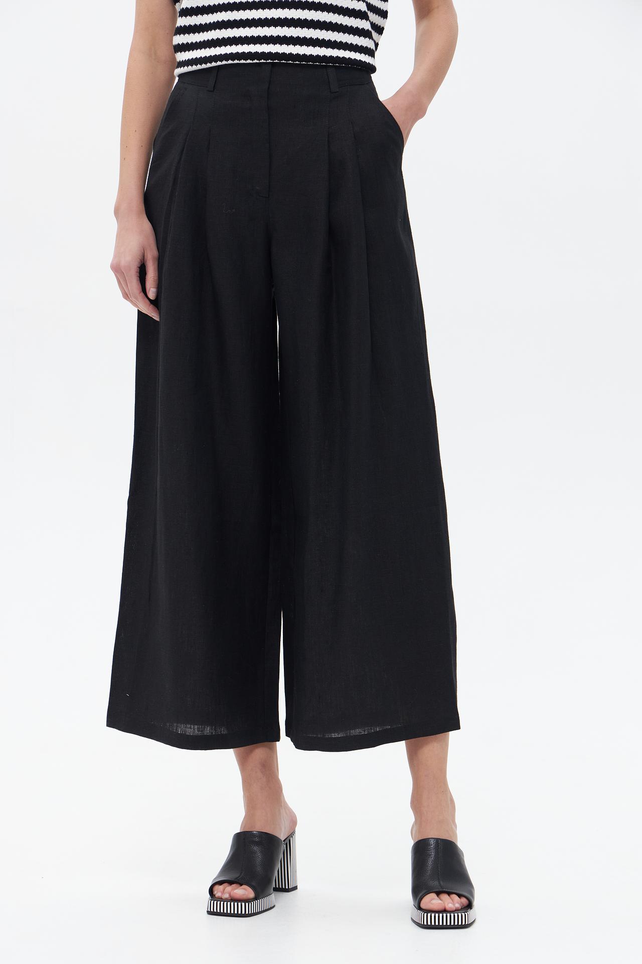 - Крой: Широкие брюки-кюлоты. Актуальный силуэт подчёркивает фигуру, не сковывая движений. Высокая посадка выгодно акцентирует талию.