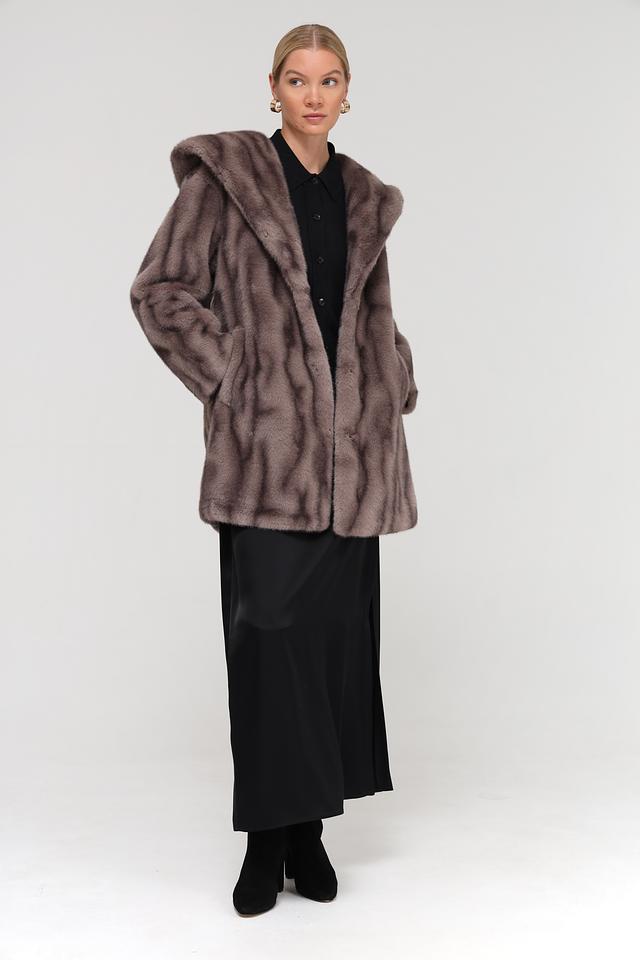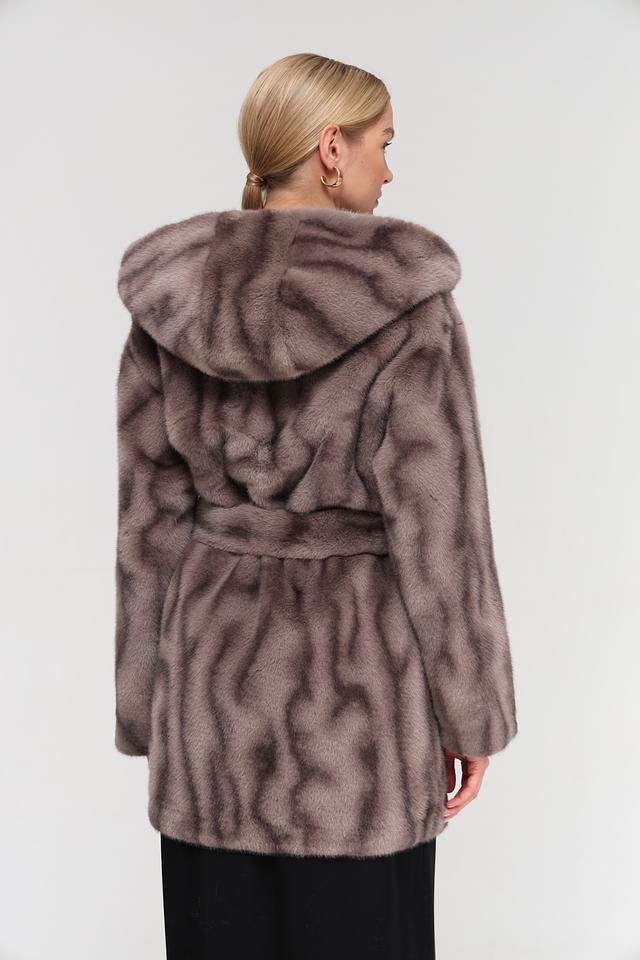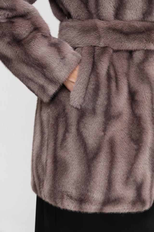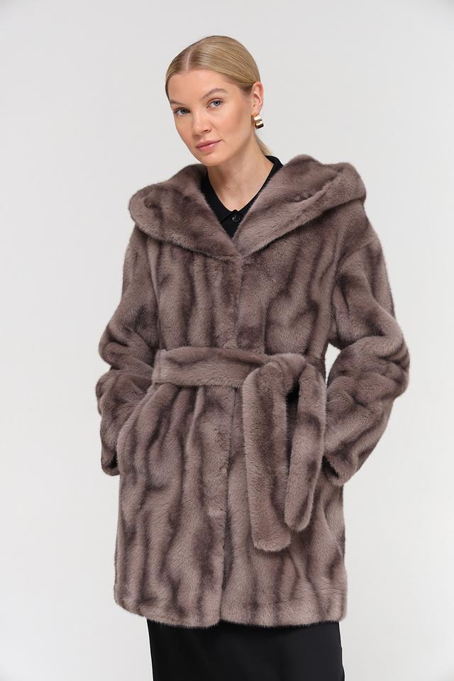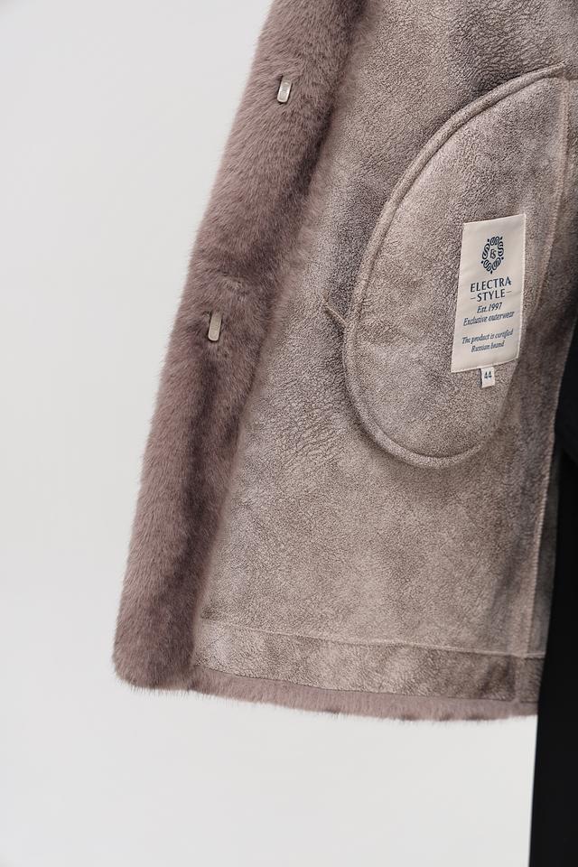 Модель оснащена поясом, позволяющим подчеркнуть талию и создать более женственный силуэт. Шуба имеет длину до середины бедра, что делает ее универсальной для различных образов.