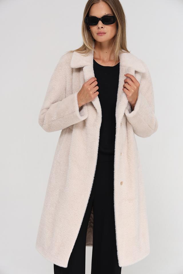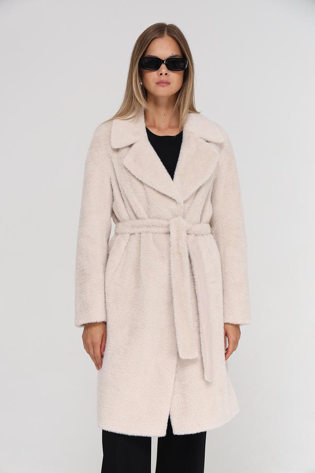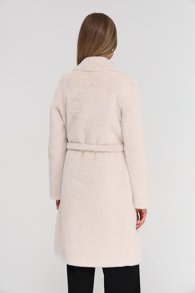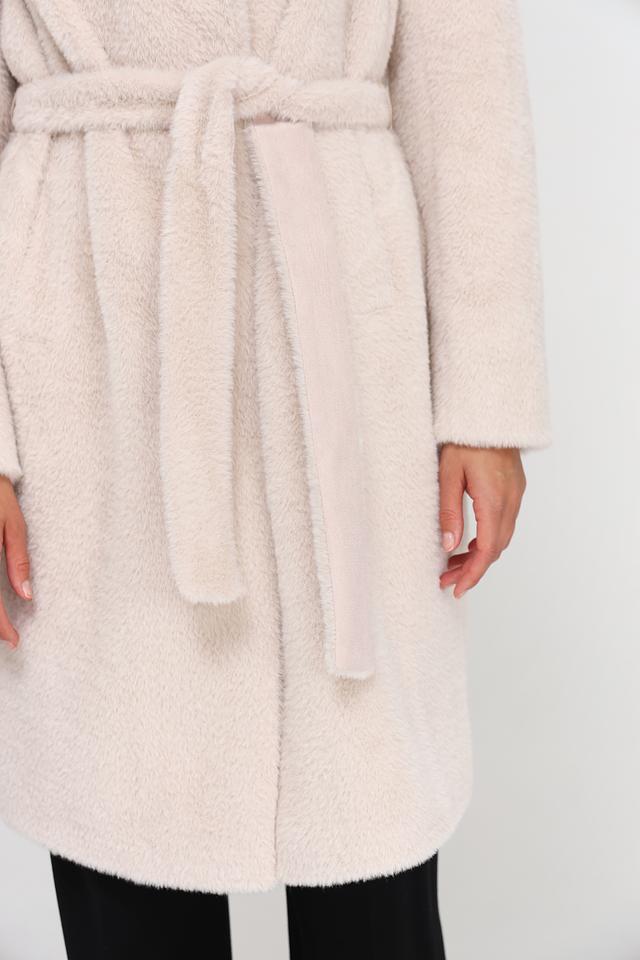 Модель имеет прямой крой, отложной воротник и застегивается на пуговицы. Пальто дополнено поясом, который позволяет подчеркнуть талию и создать более женственный силуэт. Текстура ткани напоминает мягкую шерсть, что придает пальто особый шарм.
