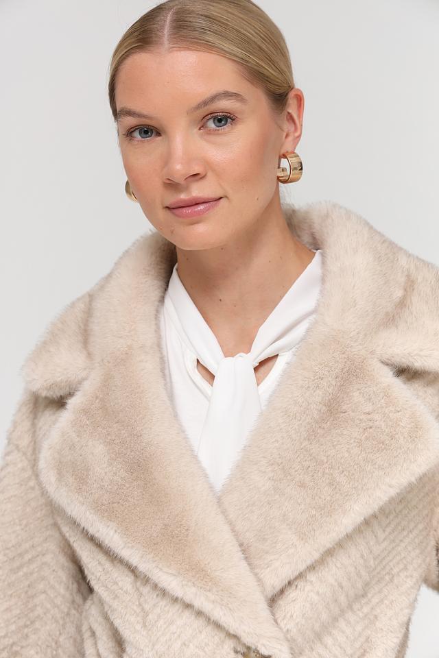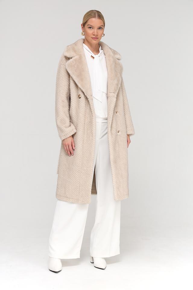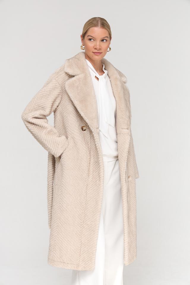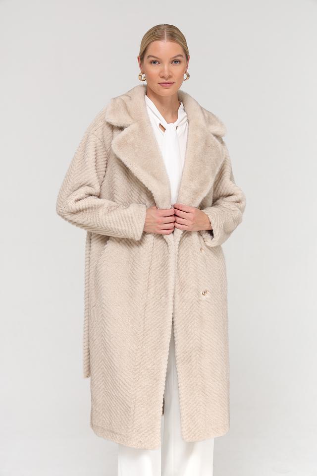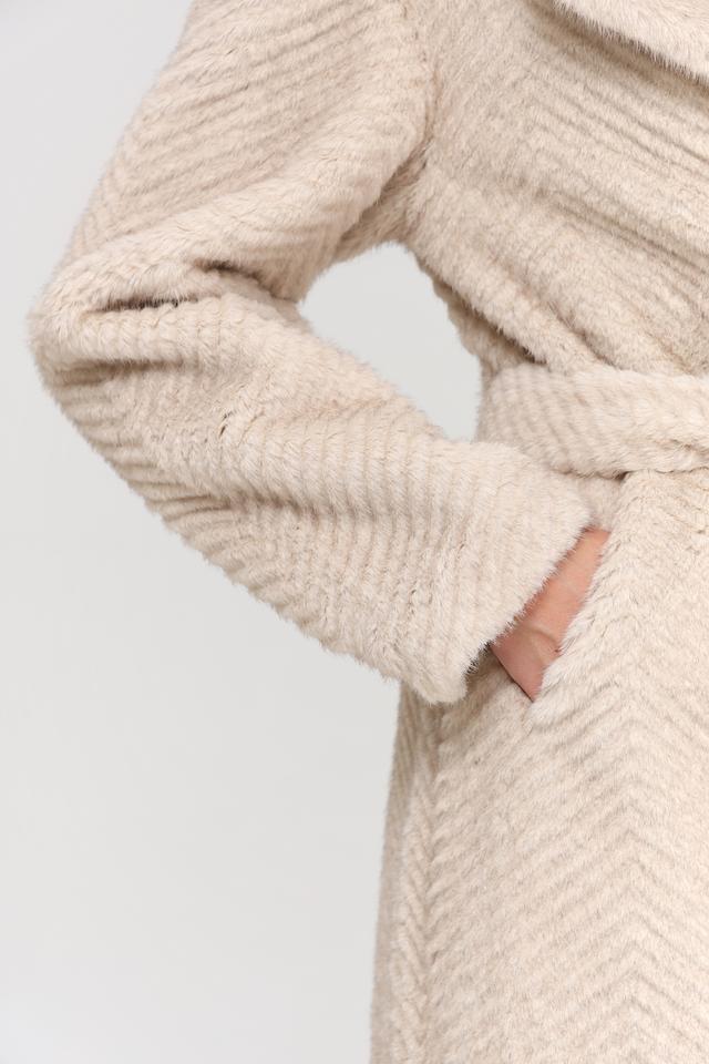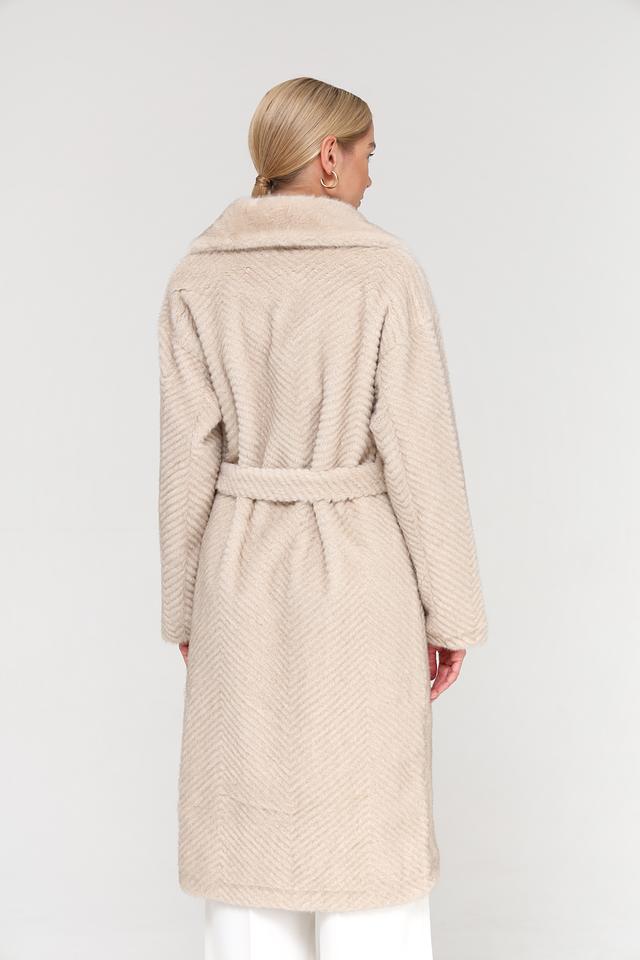 Шуба имеет бежевый цвет и фактурный узор, напоминающий зигзаг, который придает ей особый шарм. Модель дополнена поясом, позволяющим подчеркнуть талию и создать более женственный силуэт. Застежка выполнена в виде пуговиц в тон изделия.