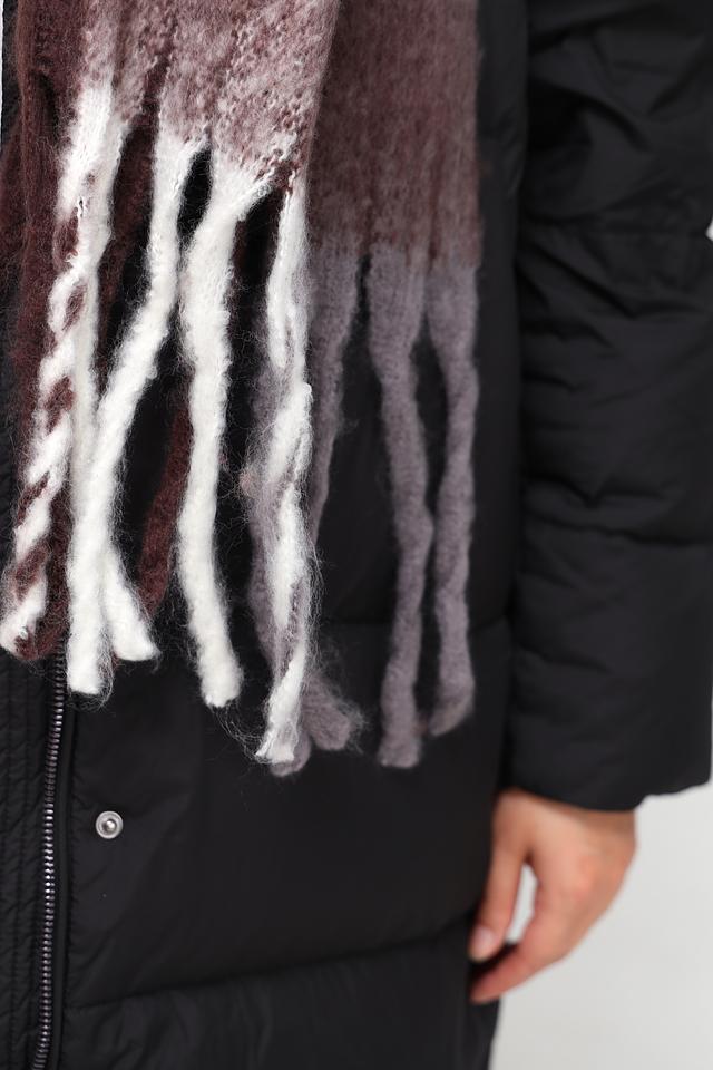 Шарф имеет прямоугольную форму и украшен длинной бахромой по краям, что придает ему особый шарм. Его размер позволяет носить его различными способами – как классический шарф, палантин или накидку.