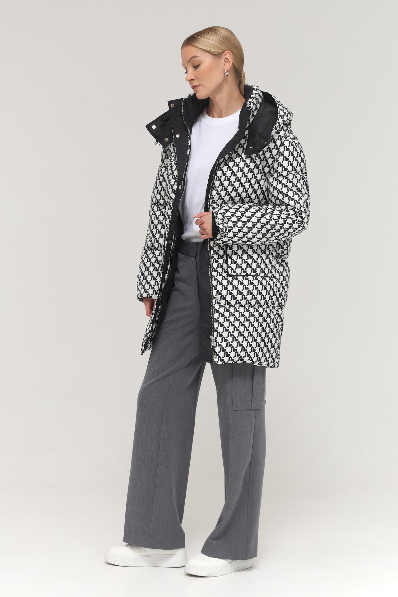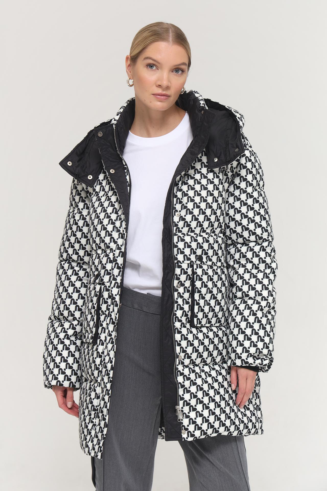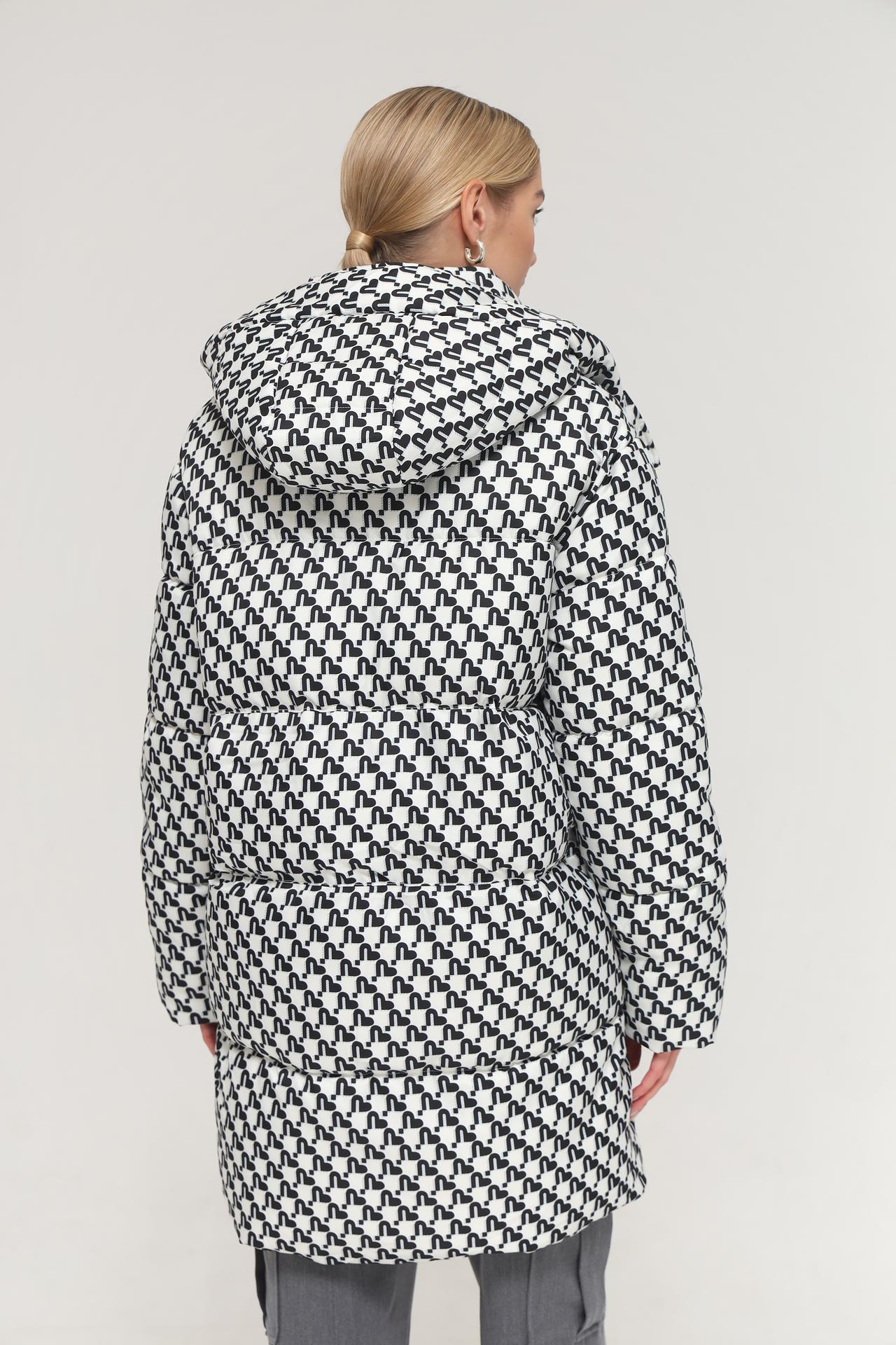 - Стильный дизайн: Чёрно-белый геометрический принт придаёт куртке уникальность и динамичность. Модель легко впишется в городской образ, подчеркивая индивидуальность.