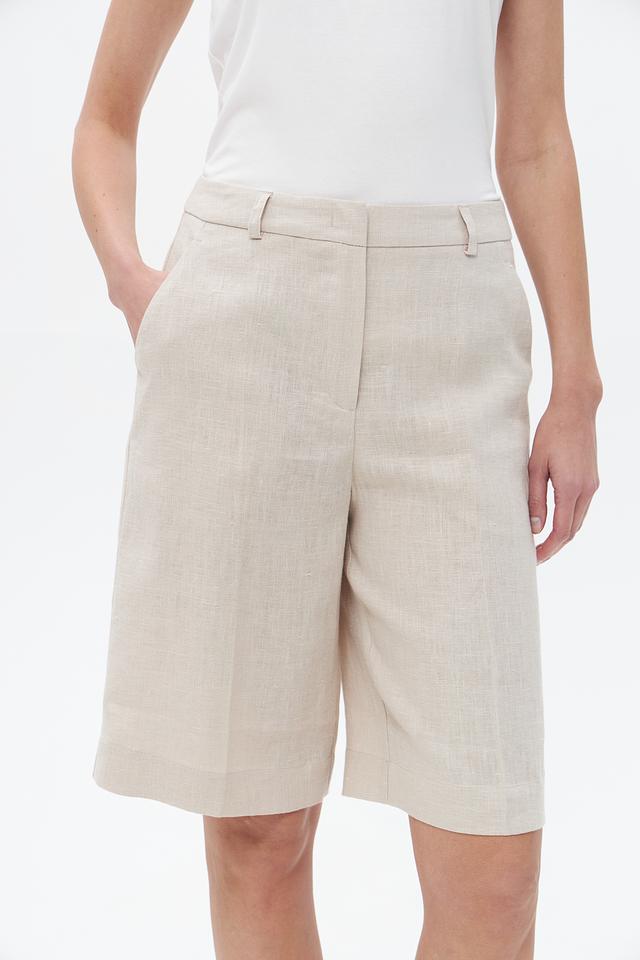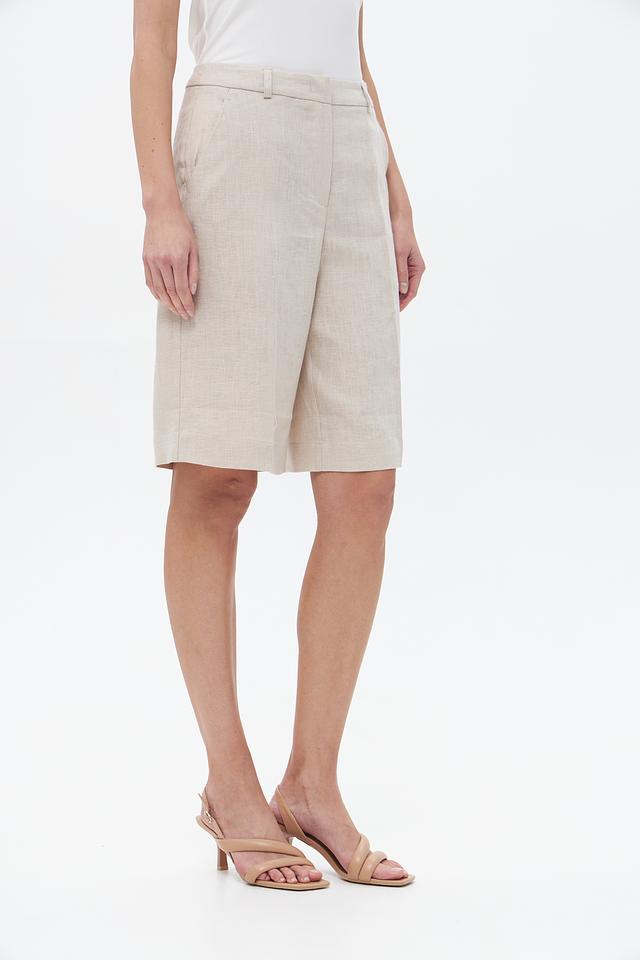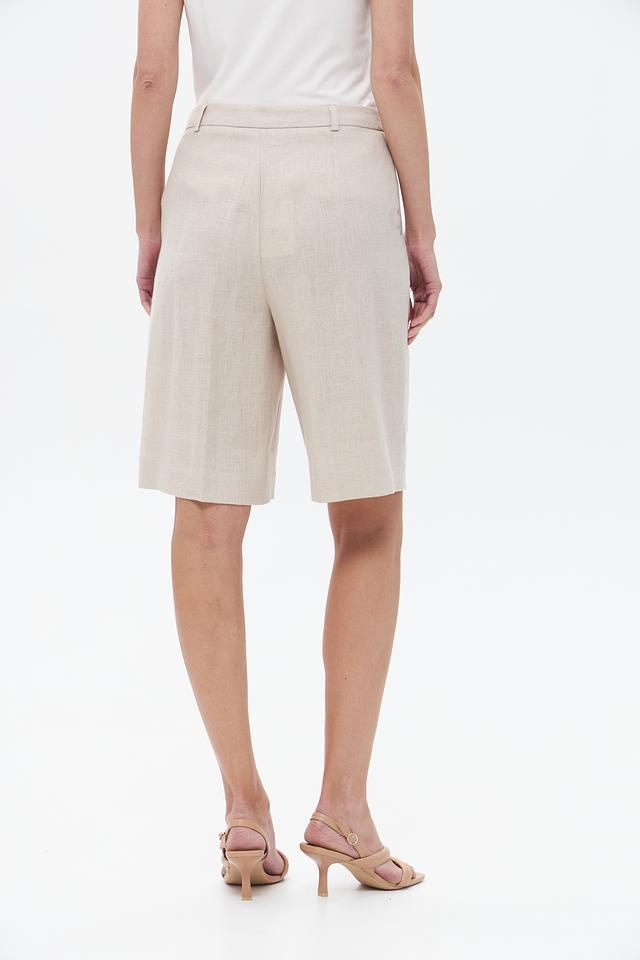 Шорты имеют классический прямой крой и нейтральный бежевый цвет, который легко сочетается с различными элементами гардероба. Они оснащены удобным эластичным поясом, обеспечивающим комфортную посадку.