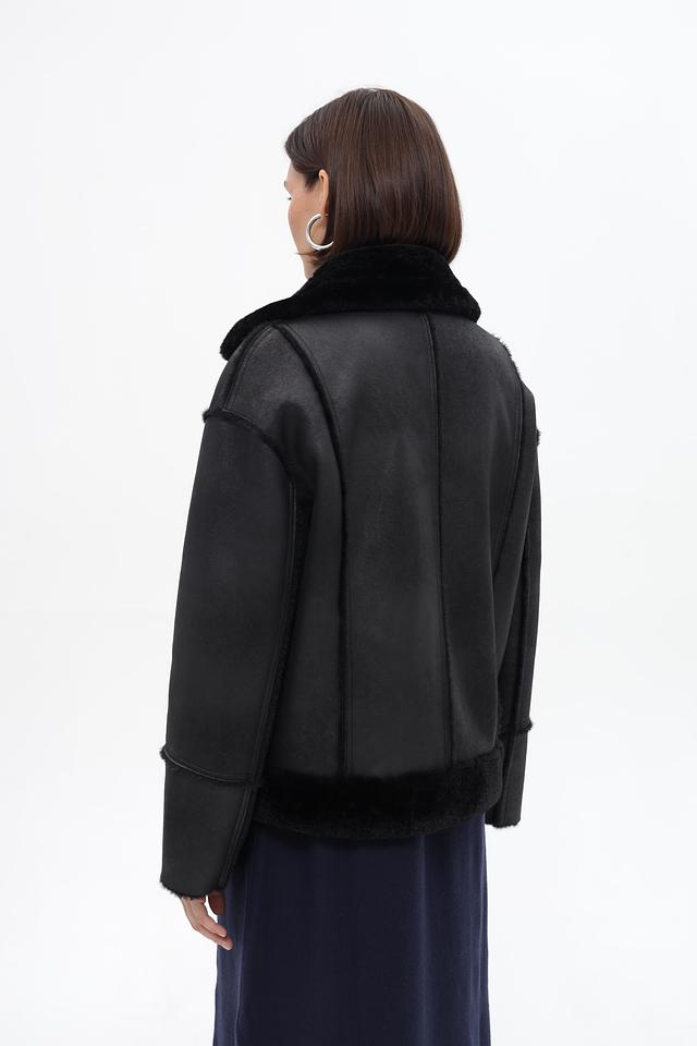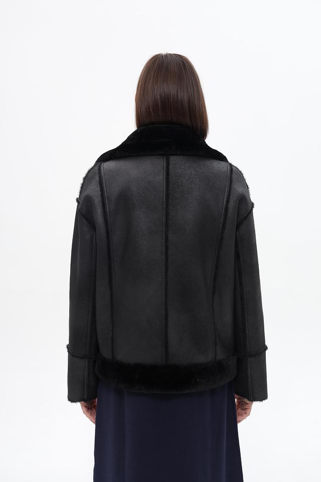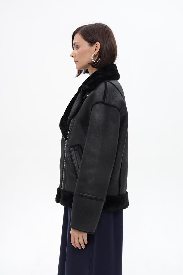 Куртка имеет прямой силуэт и короткий крой, что делает её универсальной для создания различных образов. Воротник-стойка и манжеты отделаны мягким искусственным мехом, добавляющим изделию уют и роскошь. Застёжка-молния обеспечивает удобство и надёжность.