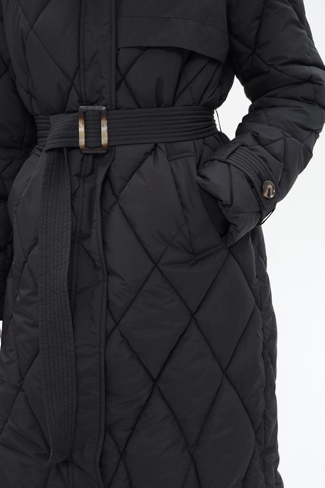 Женское пальто от Electra style выполнено в черном цвете и имеет стеганую фактуру. Модель имеет длину до середины икры, что обеспечивает дополнительное тепло и комфорт в холодную погоду.