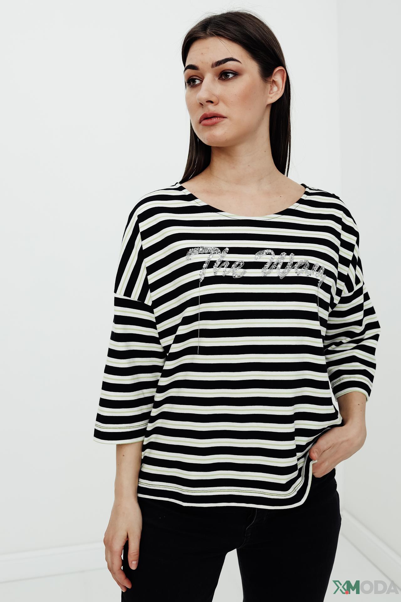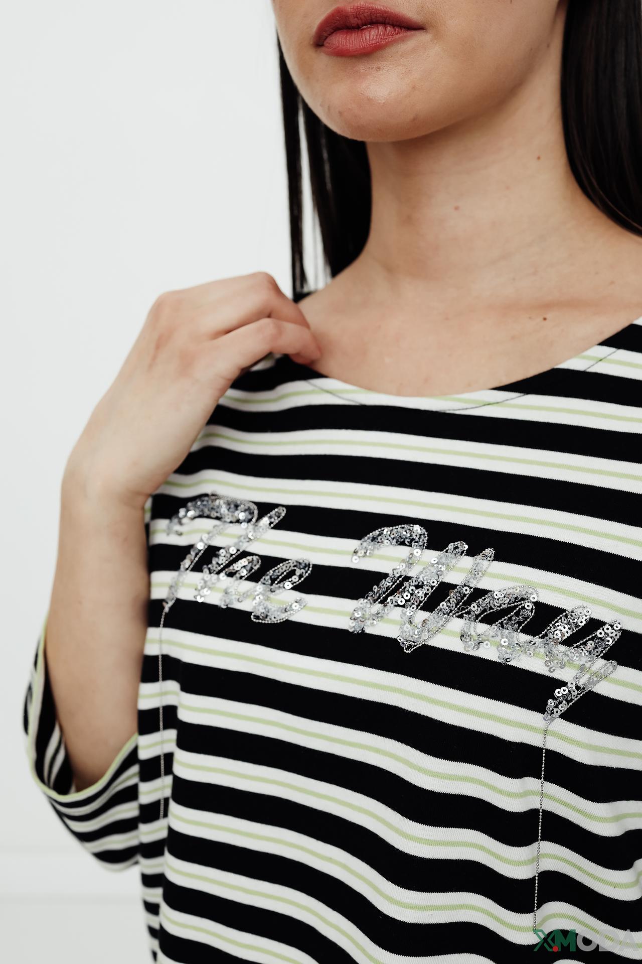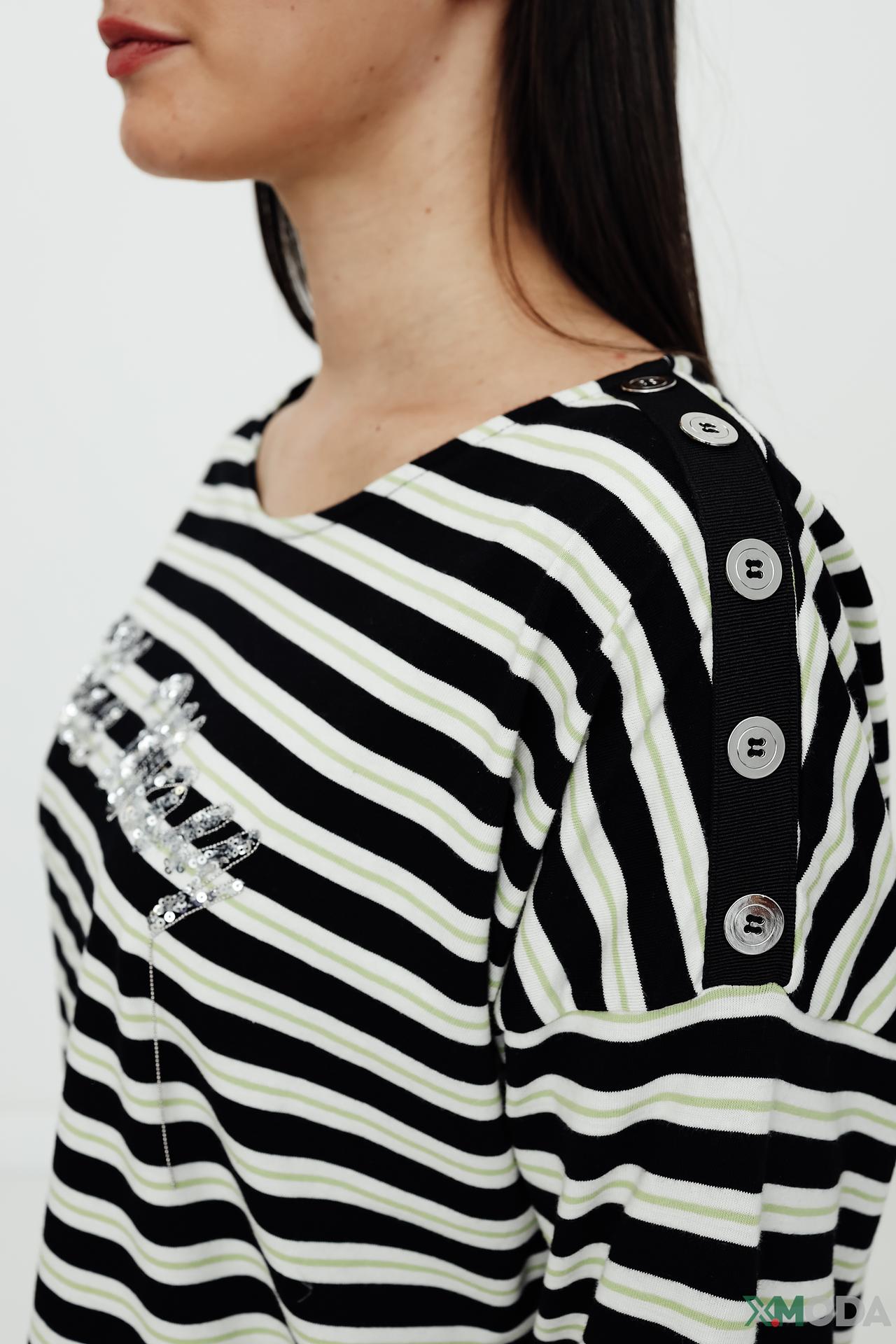 - Дизайн: Классическая полоска в черно-белой гамме дополнена блестящей вышивкой пайетками на груди. Оригинальные пуговицы на плече служат стильным акцентом.
