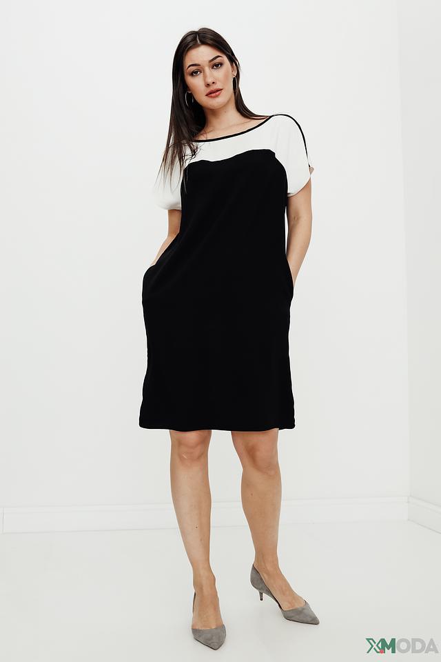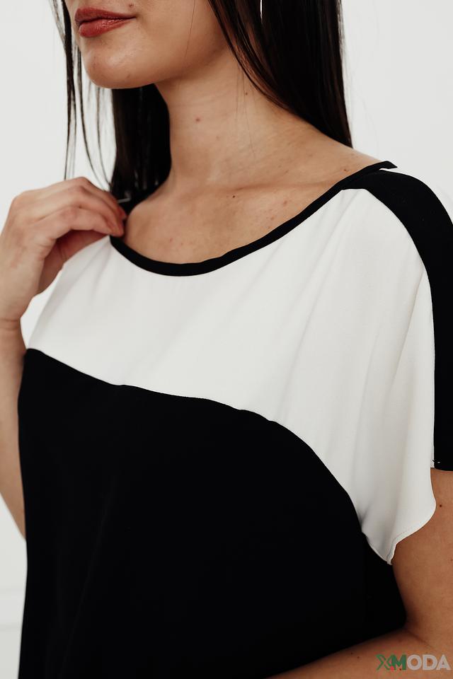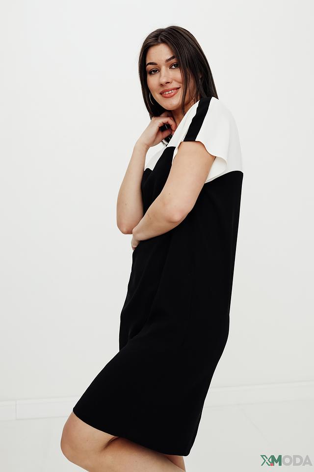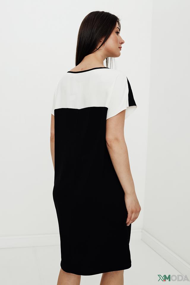 Модель отличается короткими рукавами и округлым вырезом горловины, выполненным с контрастной белой отделкой. Верхняя часть платья, включая плечи и часть груди, выполнена из белой ткани, создавая эффектный цветовой блок. Нижняя часть платья выполнена из чёрной ткани.