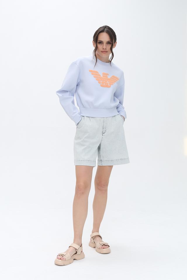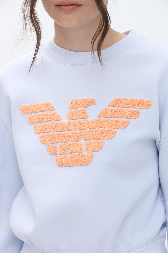 Женский джемпер Emporio Armani голубого цвета, украшен оранжевым логотипом. Модель имеет круглый вырез горловины и слегка укороченный крой. Изготовлен из мягкого хлопка с добавлением полиэстера и эластана. Состав: хлопок 76%, полиэстер 18%, эластан 6%