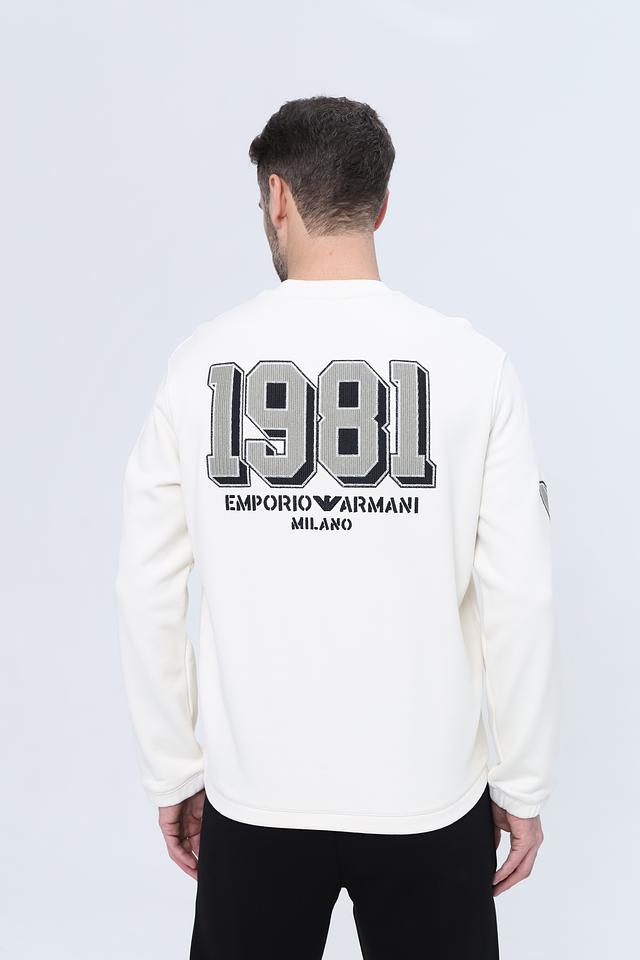 Дизайн джемпера включает в себя крупные элементы с логотипом бренда, выполненные в контрастных цветах. На груди расположен логотип "Emporio Armani", а на спине – надпись "1981" и "Milano", выполненные в ретро-стиле. Дополнительные декоративные элементы в виде полос на рукавах придают джемперу спортивный вид.