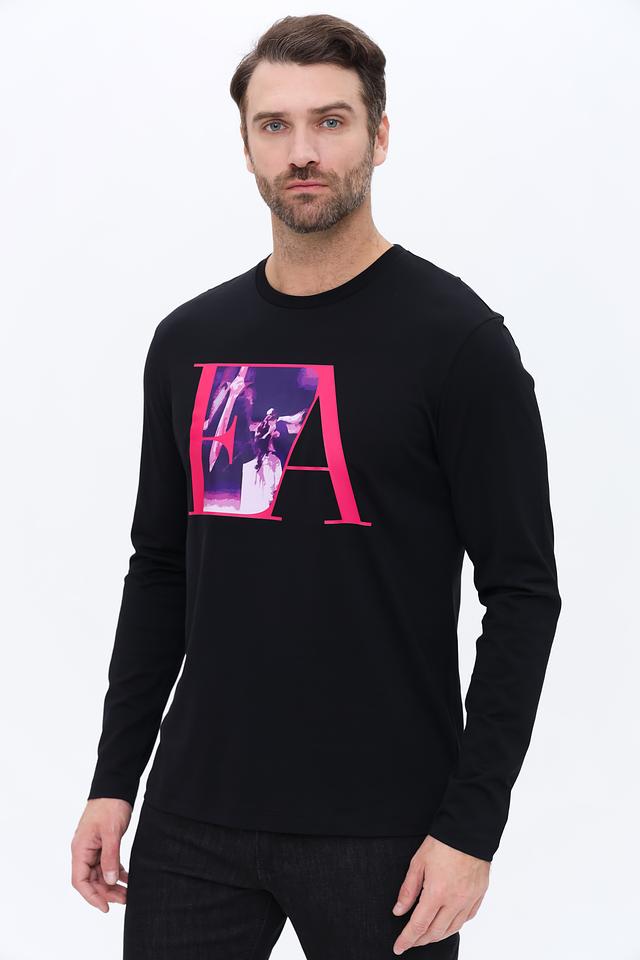 Мужской лонгслив Emporio Armani чёрного цвета с ярким принтом в виде логотипа бренда. Изготовлен из 100% хлопка, обеспечивающего комфорт и удобство в носке. Состав: хлопок 100%