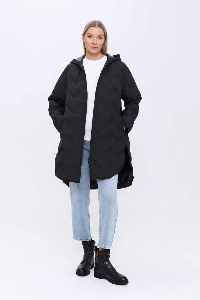 Модель оснащена удобным капюшоном, который защитит от ветра и дождя. Застёжка-молния позволяет легко регулировать степень теплоты. Пальто имеет длину до середины икры, что делает его подходящим для повседневной носки.