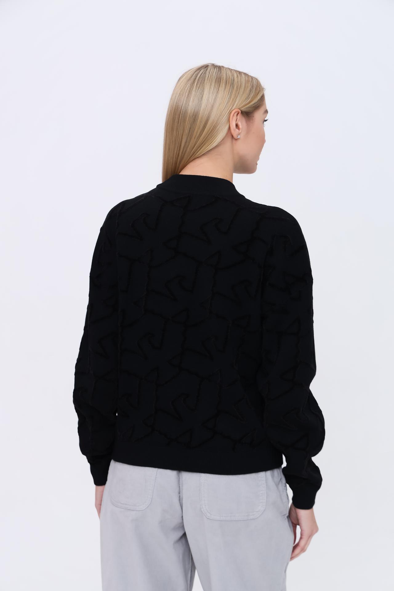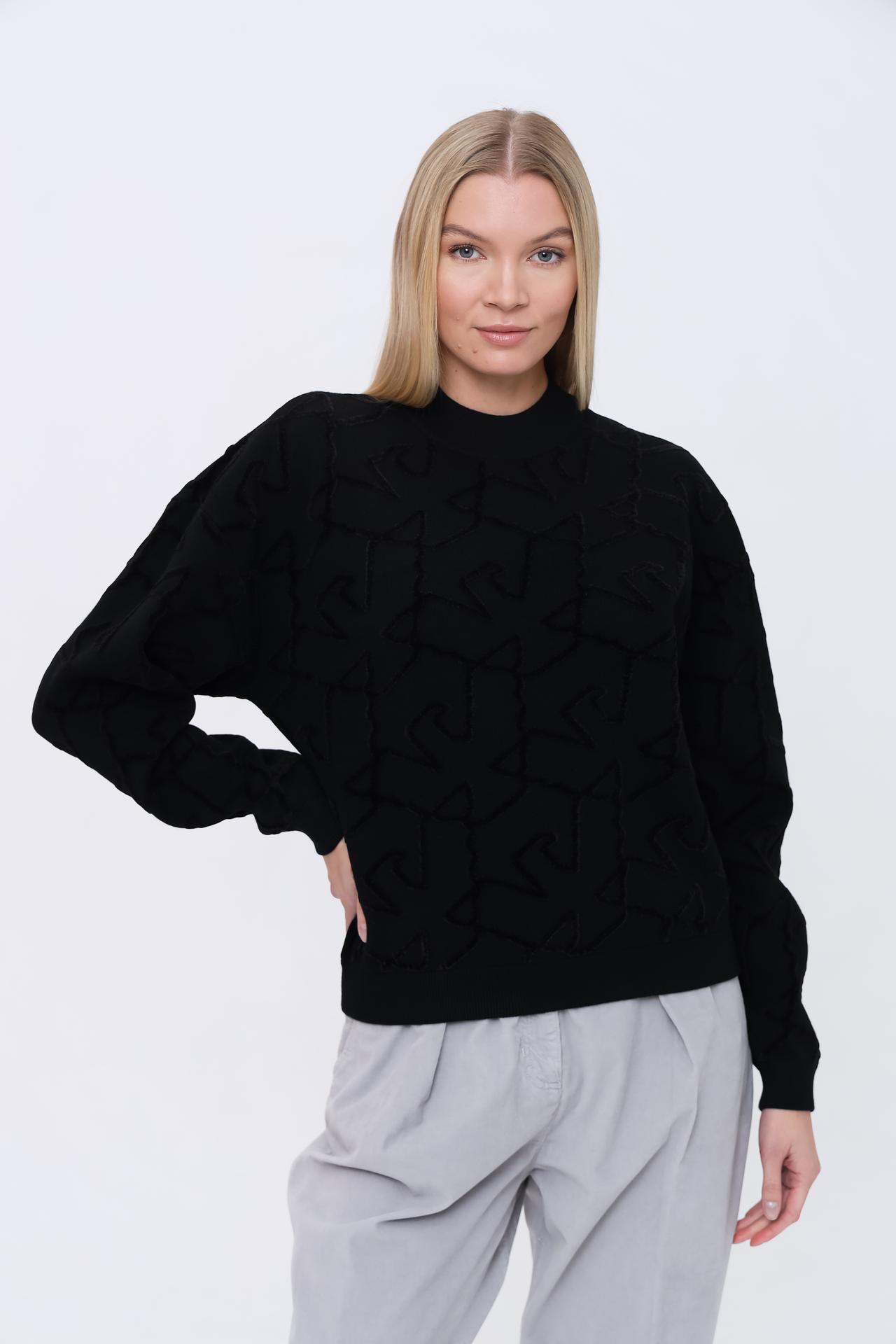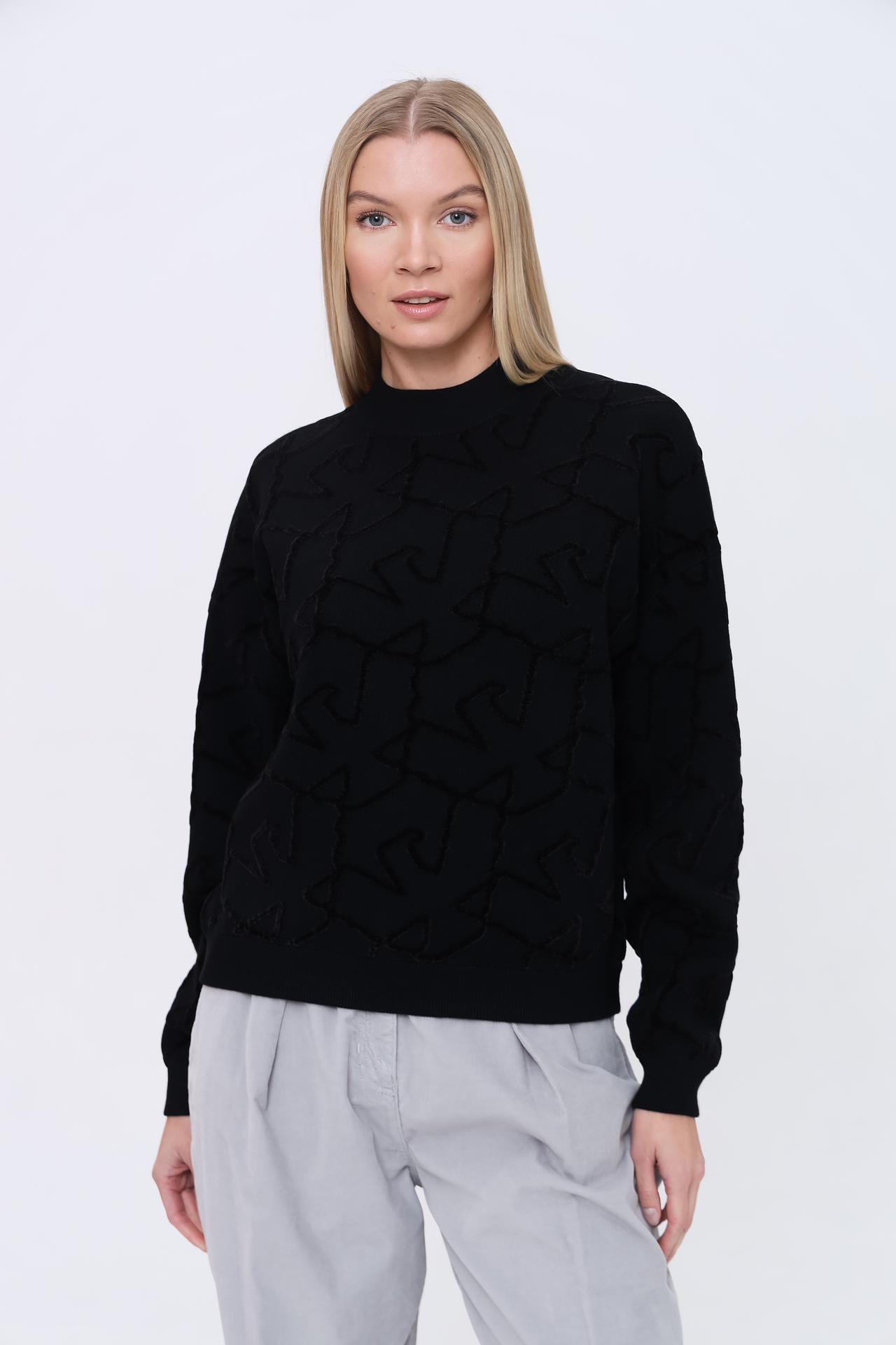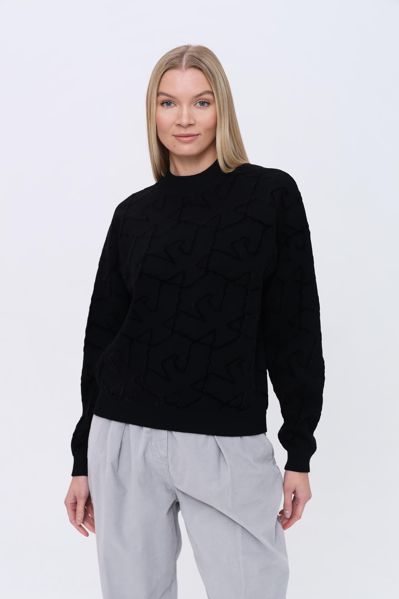 - Дизайн: Джемпер имеет прямой крой, круглый вырез горловины и длинные рукава. Объемный текстурный узор с логотипами бренда придает модели изысканность и узнаваемость.