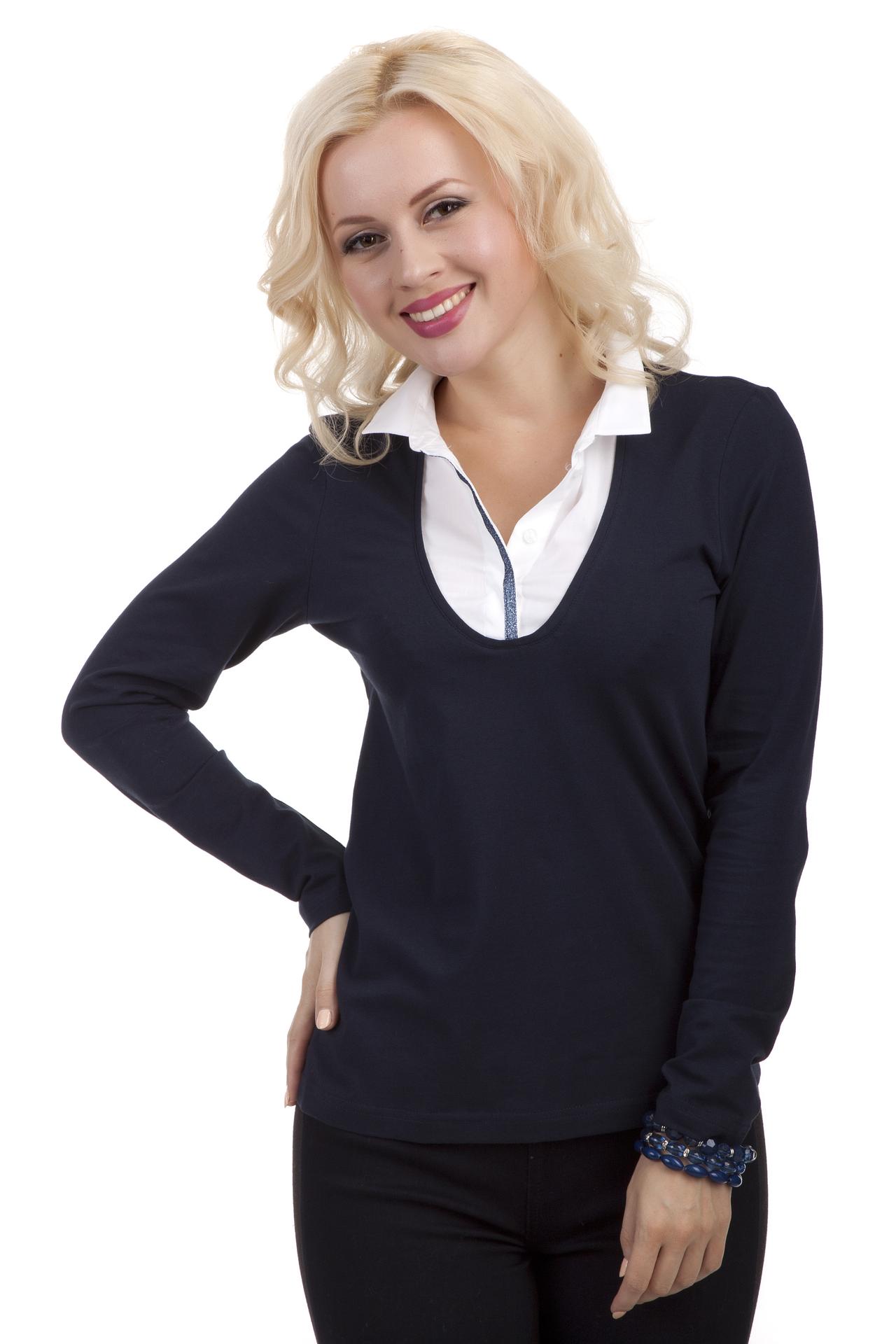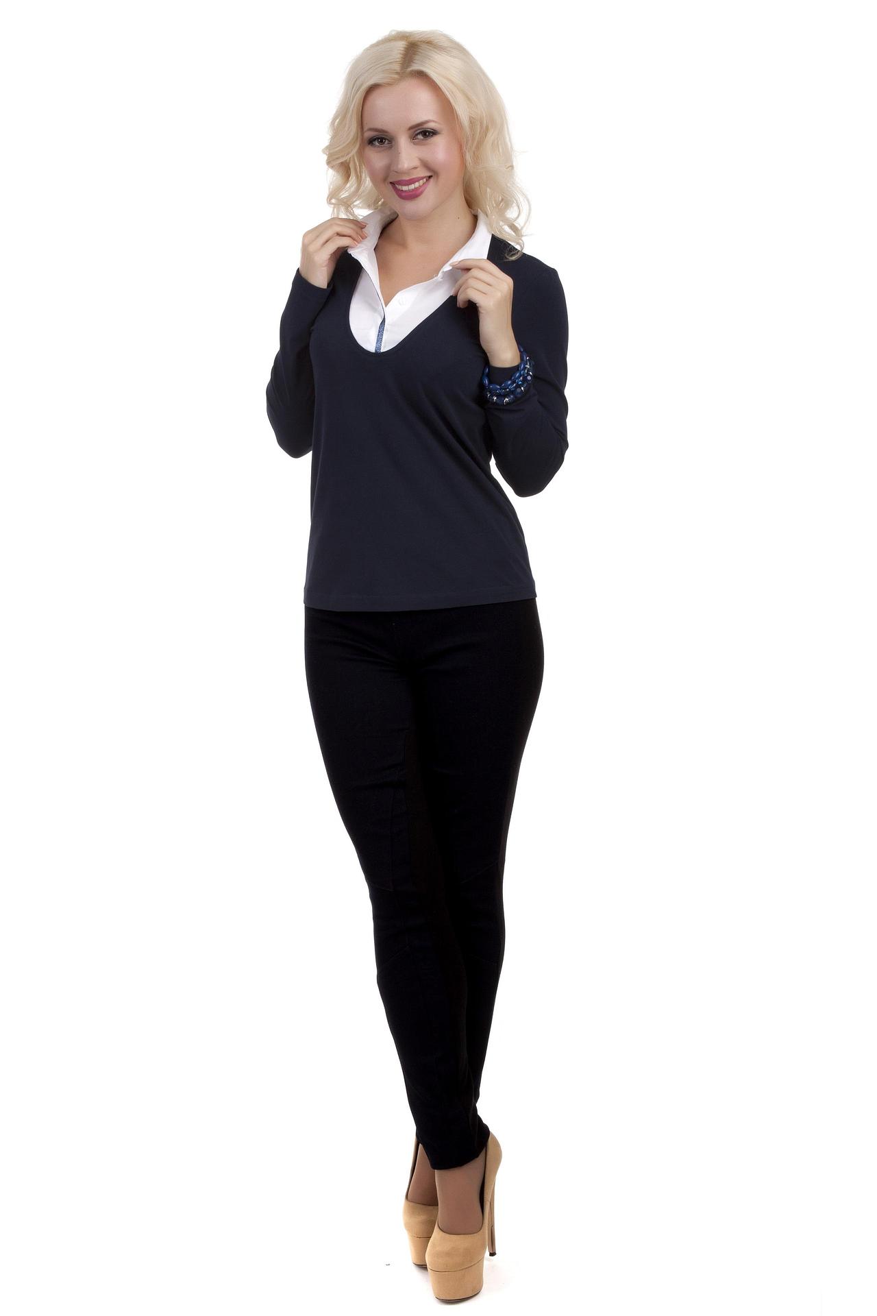 - Цвет: Насыщенный темно-синий цвет блузы прекрасно сочетается с белым воротником, создавая строгий, но женственный образ. Это универсальное цветовое решение легко комбинировать с различными элементами гардероба.