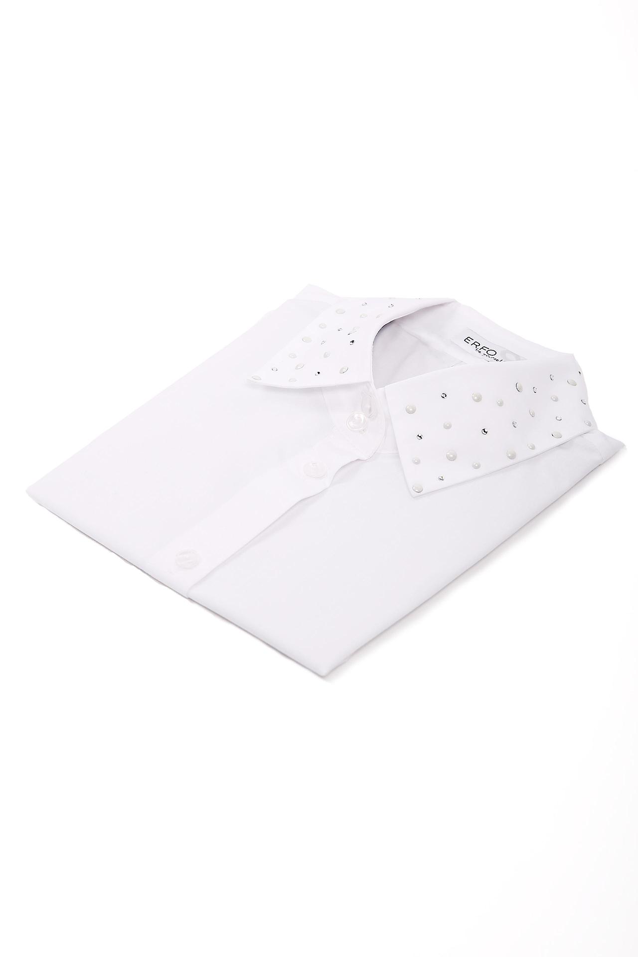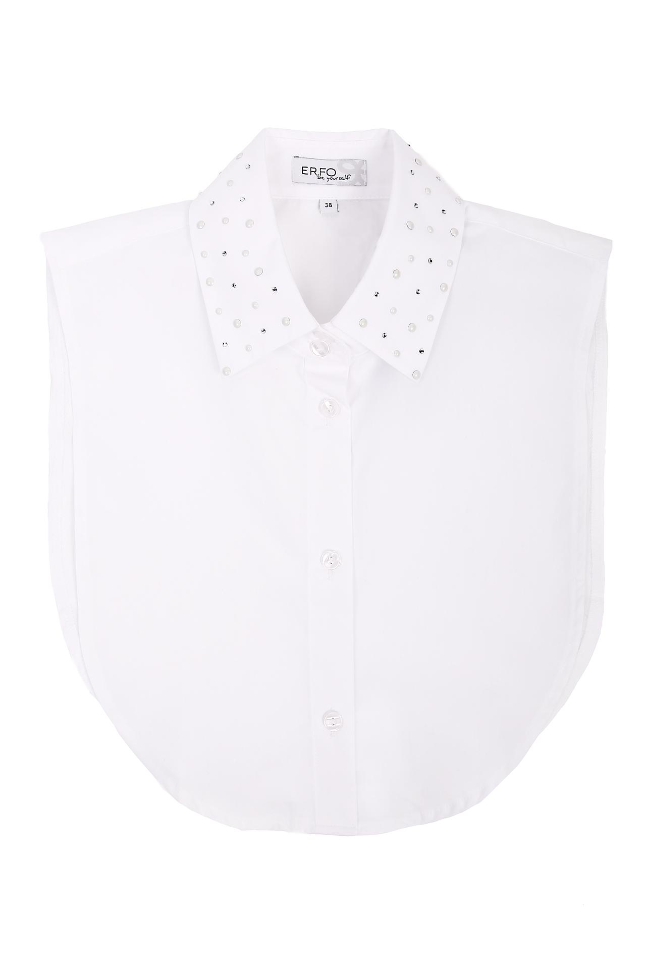 Манишка белого цвета фирмы Erfo. Ткань состоит из 65% полиэстера и 35% хлопка. Модель выполнена прямым покроем, укороченной длинны. Блуза дополнена откладным воротом на стойке, застежка на пуговицы, подшита полукругом. Ворот украшен стразами. Такую блузу можно одеть с различными деталями вашего гардероба.