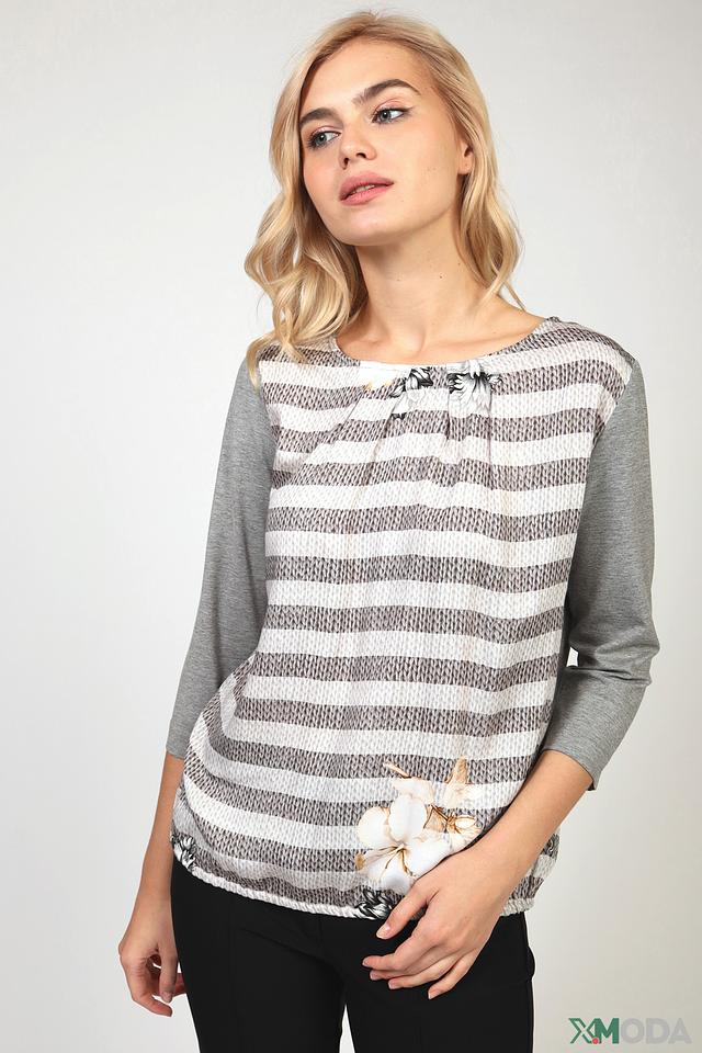 Блуза Eugen Klein серого цвета с полосатым принтом и цветочным декором. Модель выполнена из мягкой вискозы с добавлением эластана, что обеспечивает комфорт в носке и хорошую посадку по фигуре. Состав: вискоза 93%, эластан 7%
