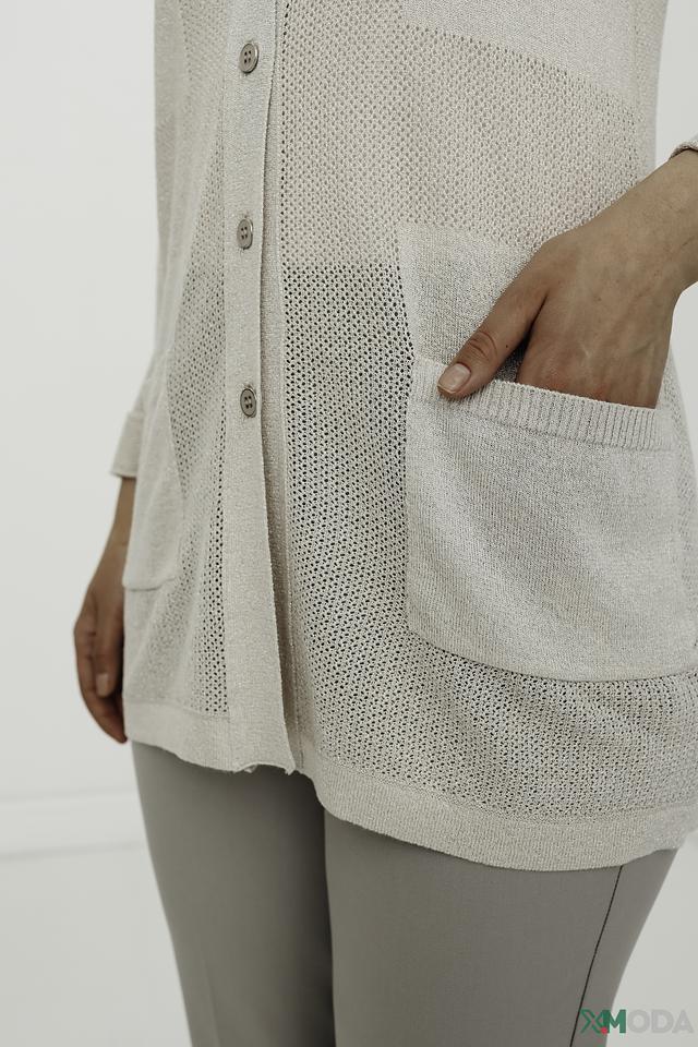 Жакет застегивается на несколько пуговиц, что позволяет регулировать степень прилегания. Модель имеет два накладных кармана, которые добавляют функциональности и практичности.