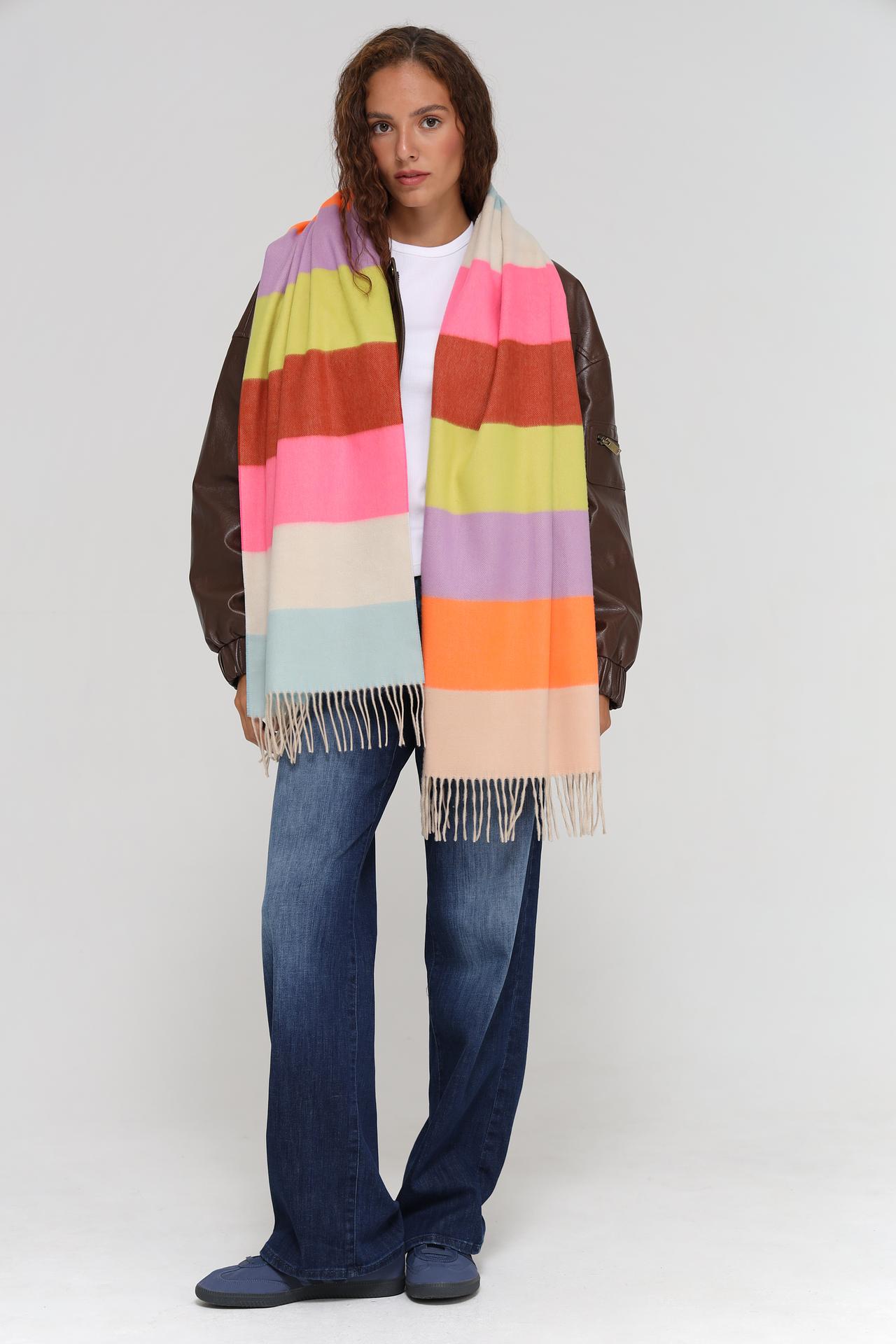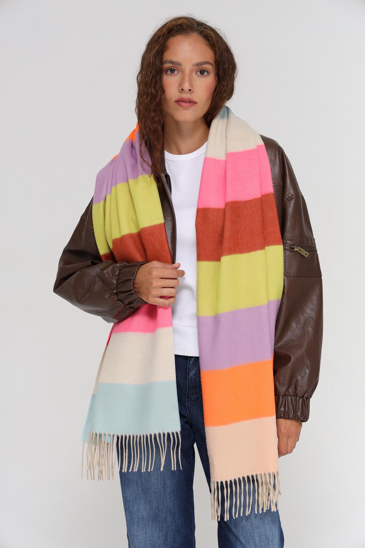 Универсальный дизайн с эффектными полосами и изящной бахромой позволяет экспериментировать с образами, добавляя красок и индивидуальности. Мягкая текстура полиакрила приятна к коже, не вызывает раздражения и обеспечивает максимальный уют. Шарф подойдет для осеннего и зимнего сезона, защищая от ветра и холода.